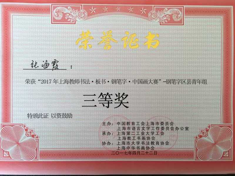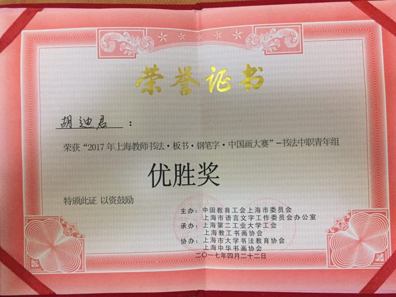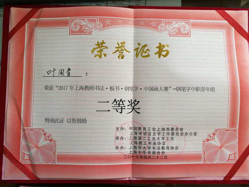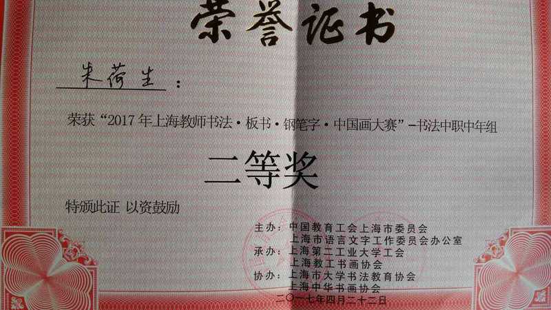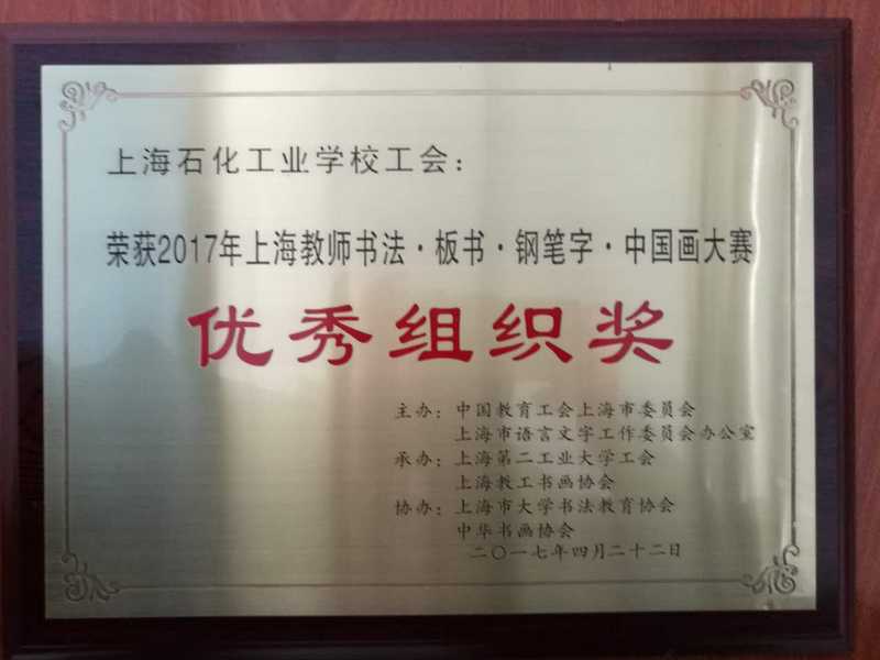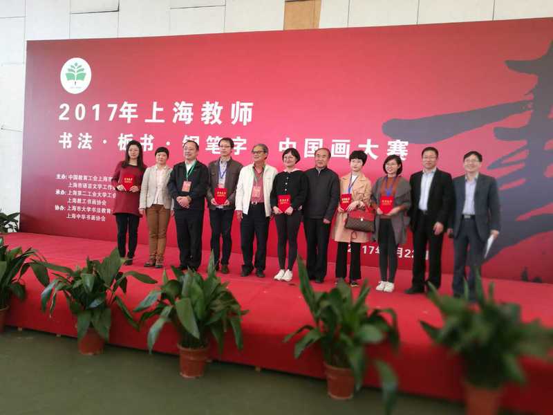4月22日上午,我校朱荷生、史秀忠、叶国青、张海霞、胡迪君五位教师在校工会的组织安排下一早赶至位于浦东新区金海路2360号的上海第二工业大学体育馆,参加了由上海市教育工会主办的2017年上海教师书法、板书、钢笔字、中国画大赛,喜获佳绩。学校工会荣获优秀组织奖,朱荷生老师获得书法中职中年组二等奖,叶国青老师获得钢笔字中职青年组二等奖,张海霞老师代表金山教育工会获得钢笔字区县青年组三等奖,胡迪君老师获得书法中职青年组优胜奖。