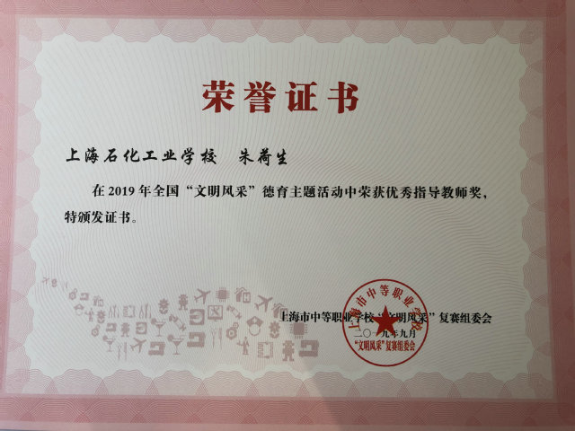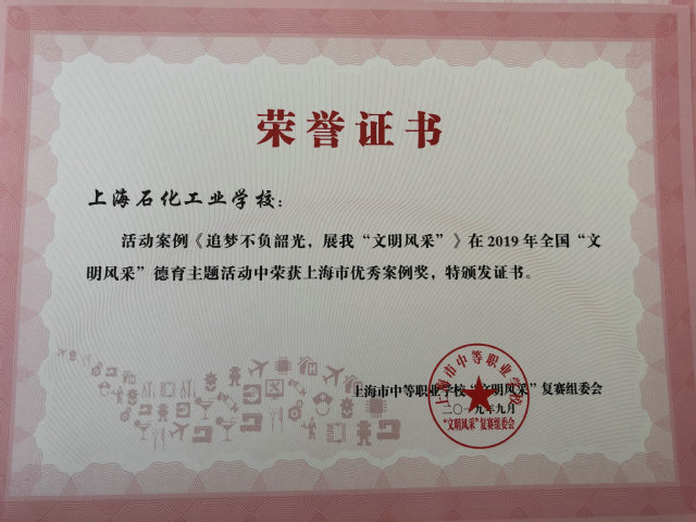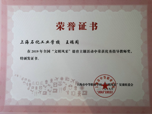 2019年文明风采活动围绕“我和我的祖国”主题,突出文化育人主线,践行社会主义核心价值观,全面提升中职学生的综合素养,展示中职学生文化素养风采。雷珍老师撰写的活动案例 《追梦不负韶光,展我文明风采》 ,介绍我校历年来征文项目组织情况,获得上海市优秀案例,入围全国优秀案例。朱荷生老师、王瑞阁老师获得优秀指导教师奖。