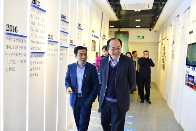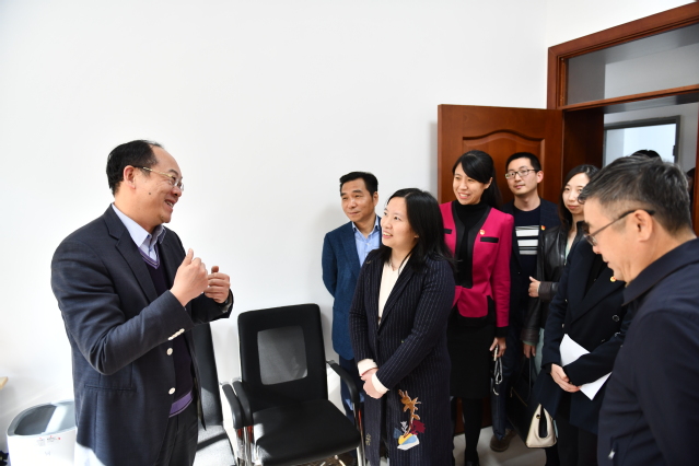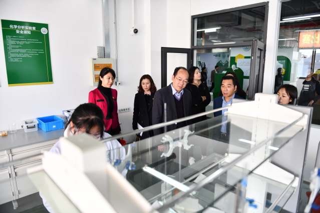 周建军一行参观了校史陈列馆与化工综合实训大楼。林国新向周建军一行介绍了学校办学历程、校企合作、德育工作、教学工作等学校整体情况。周建军饶有兴致地观看了学生实训授课情况,并对学校教育教学工作表示肯定。