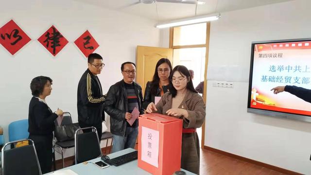 基础经贸党支部共有党员35人,应到会有选举权党员33人,因病因事请假1人,实到有选举权党员32名,超过应到党员的五分之四,会议有效。大会表决通过了《基础经贸党支部换届选举办法》及总监票人、监票人名单。会上,工作人员宣读了校党委《关于同意基础经贸党支部成员正式候选人的批复》及4位正式候选人的简历。支部党员通过无记名投票的方式选举出了新一届支部委员会书记及委员。
