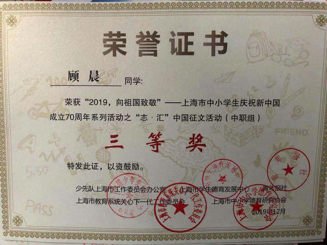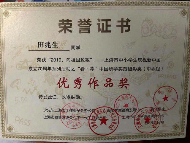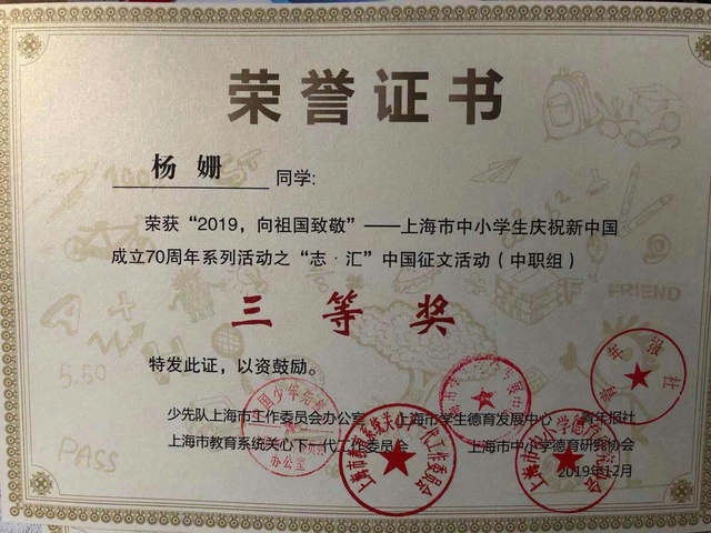 由少先队上海市工作委员会办公室、上海市学生德育发展中心、青年报社、上海市教育系统关心下一代工作委员会、上海市中小学德育研究协会举办的“2019 年上海市中小学生庆祝新中国成立70周年系列活动”结果日前揭晓,我校170应用化工班顾晨、180应用化工班杨姗同学荣获“志.汇中国”征文活动(中职组)三等奖,181机电2班田兆生同学荣获“看.荐”中国研学实践摄影活动优秀作品奖。