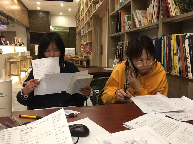 陈小宁、鄢熔熔老师在住宿酒店复习