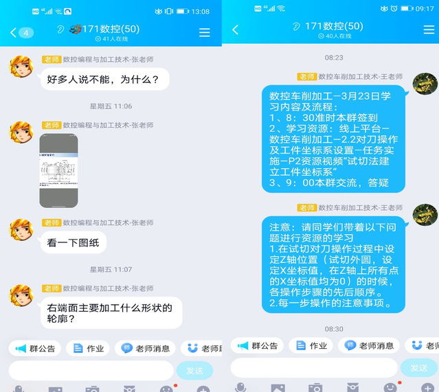 一个月的线上教学,我们全体数控应用组老师深刻体会到的是,学生的出勤率和各环节的参与度是重点也是难点。线上教学过程实施必须要确保学生的出勤率,如何保证呢?以171数控班两门专业课程的线上教学为例,这个班共38位同学,全班分为13个小组,每组2-3人,利用班级QQ群出勤签到,3分钟内老师及时统计出缺勤人员,同组学生各自负责电话联系缺勤人员,要求马上到位,这样速度快、效率高、回归及时,基本保证了出勤率。线上教学过程实施其次要确保各环节学生的参与度,为此,我们充分利用平台及班级QQ群的各项功能,最大限度保证学习过程的可视化,学习结果的可测化,各环节考核的严密化,同样分组教学也在各教学环节学生的参与度上起到了积极的作用。