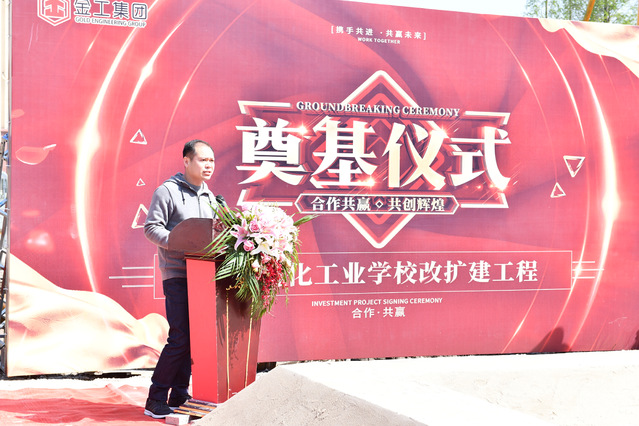 上海石化工业学校校长高炬代表业主致辞。他首先代表学校对出席本次奠基仪式的各位领导表示诚挚的感谢,并对学校改扩建项目提出三项明确要求:一是要保证质量,打造效率工程;二是要保证安全,铸造平安工程;三是要保证廉洁,塑造示范工程;期待在各有关方面的大力支持下,学校此次改扩建工程圆满完成。