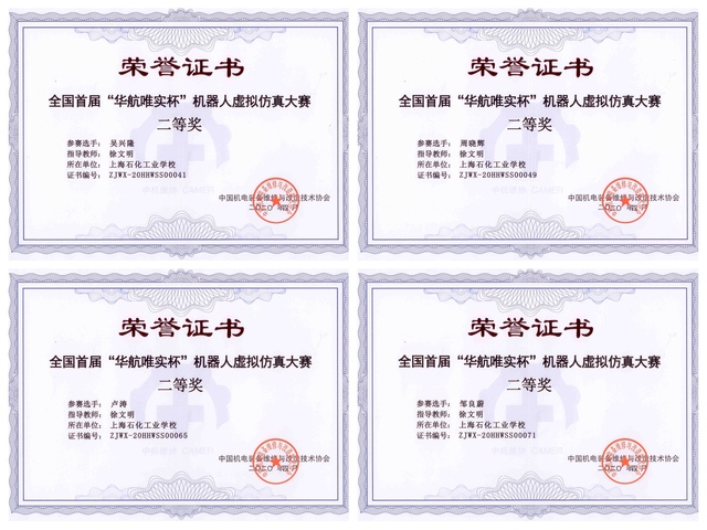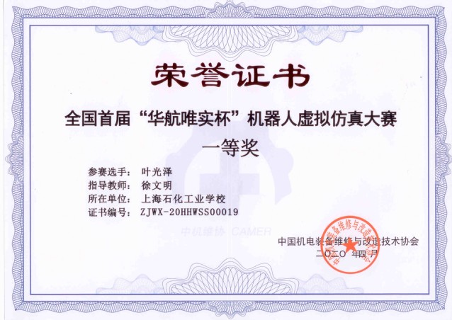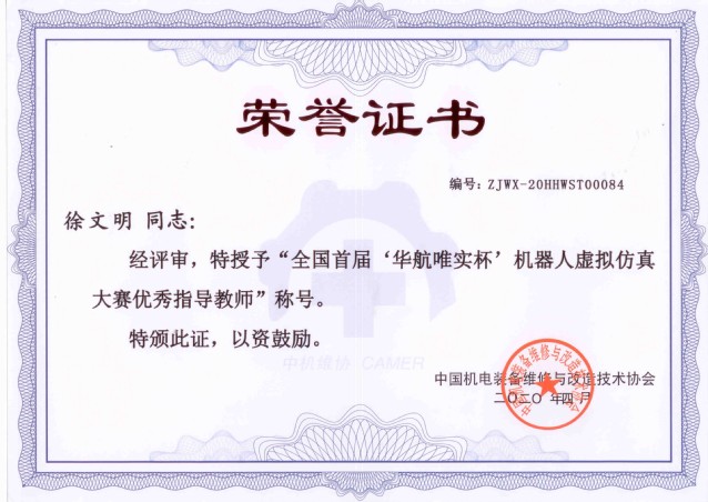 4月10日,全国首届“华航唯实杯”机器人虚拟仿真大赛在线上成功举行,大赛由中国机电装备维修与改造技术协会主办,北京华航唯实机器人科技股份有限公司承办。共有来自全国188所院校的627名选手参加比赛,我校推荐5名选手参加了该项目的比赛,我校参赛选手叶光泽在本次比赛中获得一等奖,吴兴隆、周晓辉、卢涛、邹良尉四位选手获得二等奖,徐文明老师荣获优秀指导教师奖。这是在全国抗击新型冠冠状病毒肺炎疫情期间,我校进行 “停课不停学”线上教学成果的一次检阅。