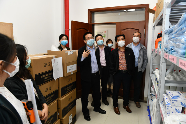 在防疫物资储备室,校领导详细查看口罩、体温计、免洗洗手凝露、消毒液、防护服等储备情况。
