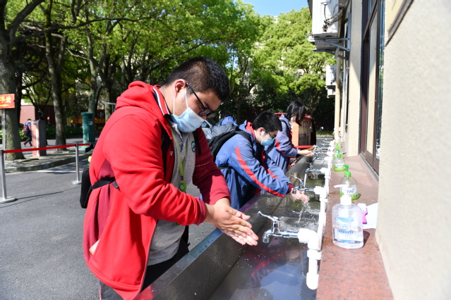 早上七点北区校门口值班领导和教师们已经上岗。在教师志愿者的引导下学生们有序进校,查体温、看随申码、进校洗手。各班级有序领取教材,打扫美化教室。在党员志愿者的引领下学生们错峰分流就餐,从进食堂前的手清洁、拿餐盒、就位用餐、回收餐盒等各个环节上严格要求,确保学生之间保持安全距离,防止人员密集。班主任带领学生学习校园防疫须知、突发状况应急处理流程和日常防护须知。随后学生收看“复学第一课”,了解我国抗击新冠肺炎疫情的最新情况,学习防疫期间先进人物的事迹,以及复学后的心理调适,还开展了爱国主义主题班会。