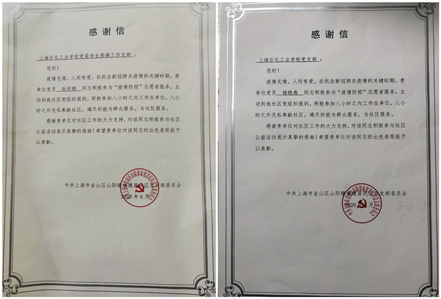 疫情发生以来支部认真落实上级党组织要求,充分发挥基层党组织战斗堡垒作用和党员先锋模范作用,党员“双报到”率百分百,把投身疫情防控第一线作为践行初心使命、体现责任担当的试金石和磨刀石。支部党员通过“心联鑫”“微行动”方式认领参与“阻击堡垒、战役先锋”公益项目,带头做好疫情防控的证明宣传引导,发扬不畏艰险、无私奉献的精神,积极参与社区人员排摸和小区出入口执勤等工作。社区党组织充分肯定支部党员志愿者行动,开学之初特寄来感谢信。