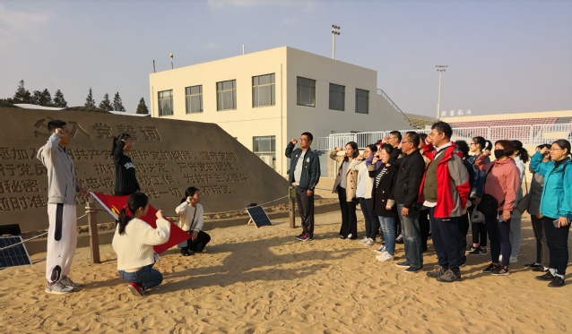 在刻有入党誓词的主题沙雕面前,党员们再次面对党旗,举起右拳,在本周刚刚转正的新党员尹吉同志的领誓下一起庄严宣誓,表达了对党忠诚、对共产主义事业奋斗终身的决心。