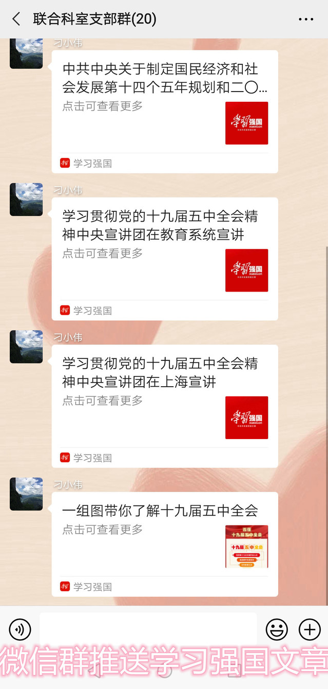 会前,联合科室党支部利用微信群等广泛推送“学习强国”中有关全会精神解读的相关文章,推动党员学习往深里走、往心里走、往实里走。