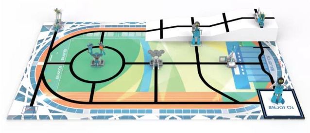 ENJOY AI—奥运会开幕式项目,共设置文艺汇演、运动员入场、升会旗、火炬传递、点燃主火炬等8个任务。该比赛是经典任务赛,选手须在有限的时间内高效规划任务路线,设计精巧的机械结构,应对场地任务的各种变化。该赛项让学生自主完成机器视觉编程,对于数字,通过Python编程,来完成机器人运行。比赛为任务得分制,按分数高低排名。