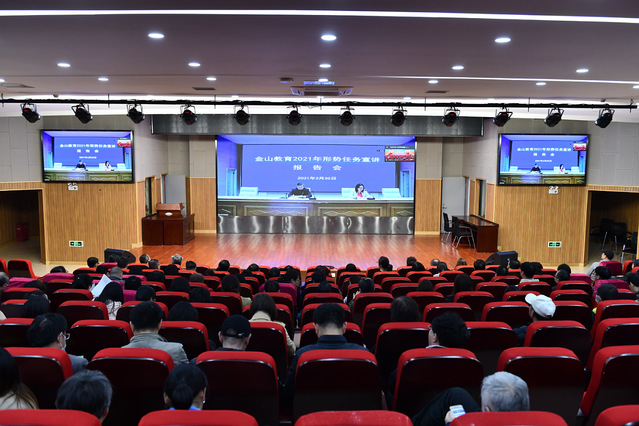 3月30日,区教育工作党委组织召开中心组学习(扩大会),区教育工作党委书记顾宏伟作2021年金山教育形势任务宣讲。校党委书记林国新,党委副书记、校长高炬参加主会场会议,全校教职工于会议中心观看视频直播。