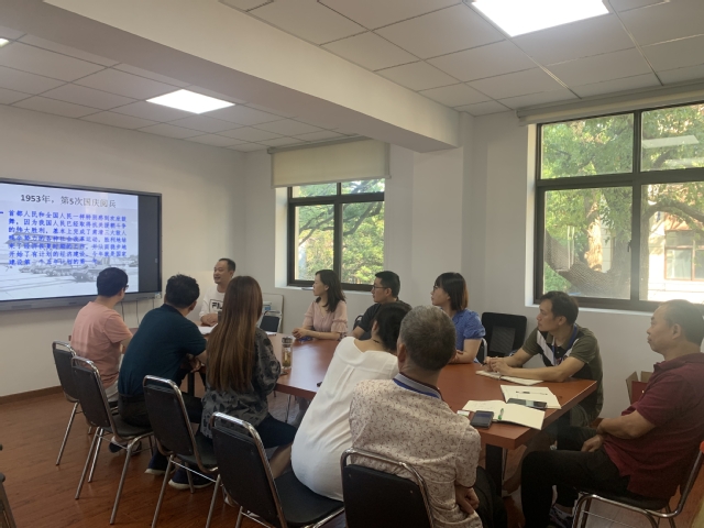 阅兵是国庆节的一件重要大事,是一项极其隆重的军事仪式,是展现我国武装力量的建设成就,也是树立民族自信心和自豪感的重要形式,体现了一个国家的国威、一支军队的军威、一个民族的浩然正气。赵东晓带领党员同志们学习了新中国建立以来的15次国庆阅兵及影响较大的7次大阅兵,用形象生动的图片和语言为大家总结了每次国庆阅兵的亮点和时代特点。