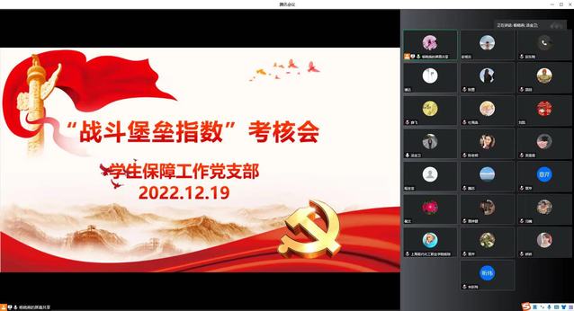 12月19日中午,学生保障工作党支部通过在腾讯会议方式召开“战斗堡垒指数”考核会。支部全体党员和群众代表参加了本次会议,会议由支部书记主持。