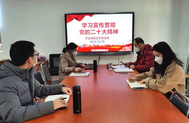 为把支部党员、群众的思想统一到党的二十大精神上来,把力量凝聚到党的二十大确定的各项任务上来,学生保障工作党支部深入学习宣传贯彻党的二十大精神,深入理解内涵,精准把握外延。12月19日中午,支部通过腾讯会议组织专题学习,本次学习的主题是“促进世界和平与发展,推动构建人类命运共同体”。支部书记杨晓燕组织学习,团委书记彭旭东、支部委员赵东晓和陈靖出席线下会议。