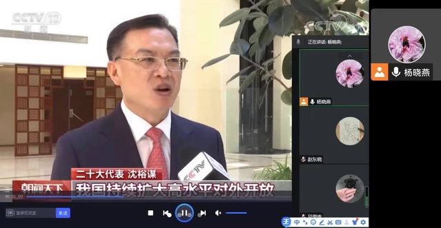 大家首先观看了二十大代表专访。二十大代表们表示,中国持续扩大高水平开放,同世界分享发展机遇,展现出推动构建人类命运共同体的坚定决心和大国担当。人类命运共同体理念,揭示了世界各国相互依存和人类命运紧密相连的客观规律,反映了全人类共同价值,找到了共建美好世界的最大公约数,为全球治理体系改革和建设贡献中国智慧和提供了中国方案。