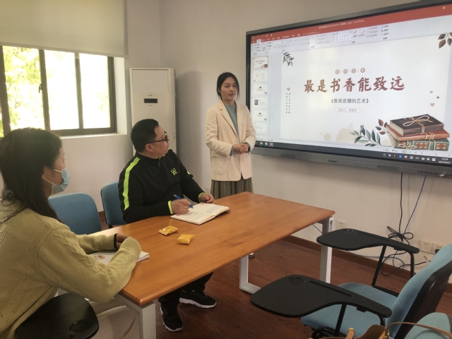 分享会上,周漫青老师为参会教师推荐了张文质老师的《教育是慢的艺术》。周老师从作者简介、内容简介、核心教育理念、个人感悟等4个方面围绕手头的班级管理工作畅谈了读书心得。