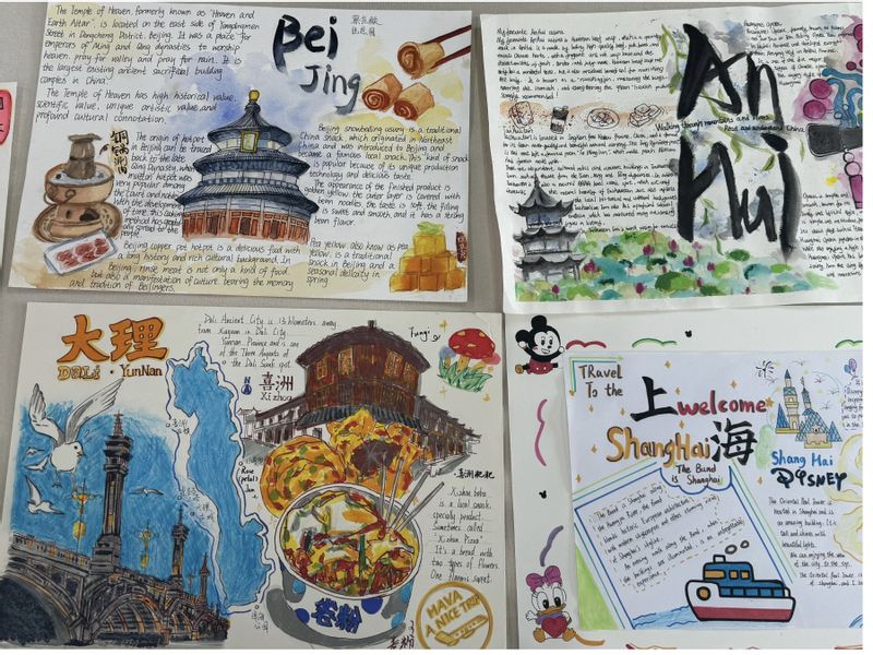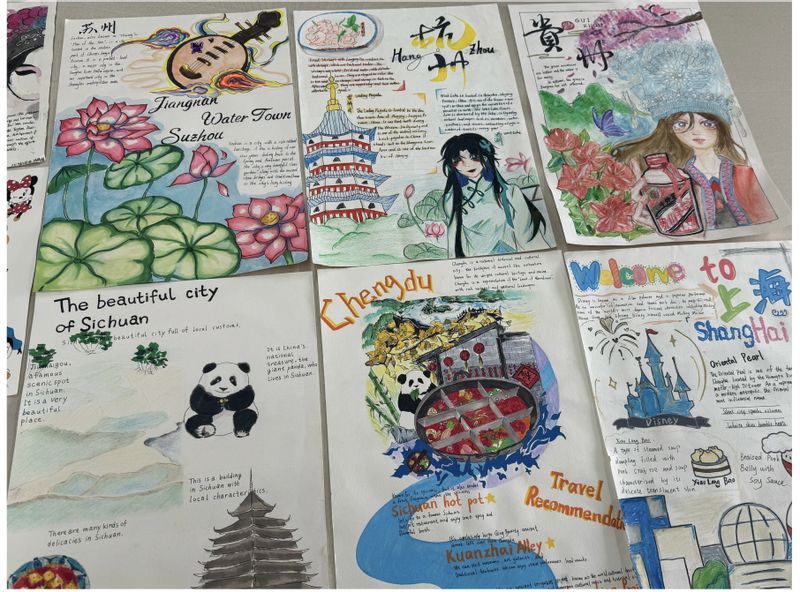 本次海报设计围绕“我最喜欢的中国旅游城市、旅游经历、旅行家”,鼓励学生运用所学英语知识展现中国的旅行魅力,通过展示风景名胜、历史文化、民俗风情、city walk、美食特色、冒险精神、探索欲望等内容,鼓励学生将英语学习与艺术活动协调发展,引导学生对中国各省份地理、文化等知识有进一步了解,在“游览”中国的过程中增强了对祖国大好河山的热爱。同学们一笔一划的描绘,既是自身英语和才艺能力的展现,也表达了对祖国疆土的热爱。
