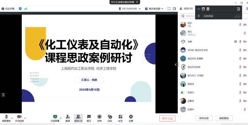 张鹏老师分享了所任教的《化工仪表及自动化》课程的思政案例。他在教学中注重学生化工安全、清洁生产、健康、环保、节能和质量意识的培养,通过实训操作前的安全教育,工作流程计划的制定,操作规范,数据记录和结果分析等流程的不断强化训练,锻炼学生的耐心与毅力,逐渐养成其认真负责、严谨细致、精益求精的职业态度。