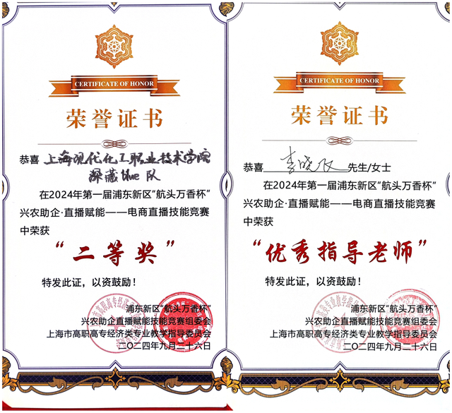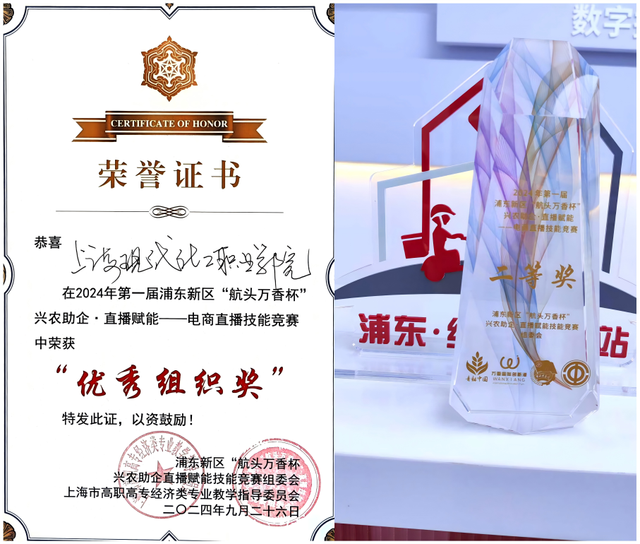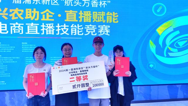 9月26日,第一届浦东新区“航头万香杯”兴农助企·直播赋能——电商直播技能竞赛决赛在浦东新区万香国际创新港举行。来自企业、高校、中职院校的32支队伍同台竞技,展示直播营销的魅力。我校230高职学生桂杰仁、陈艺乐和庄晓霞组成“深藏Blue队”,在指导老师李晓飞的陪同下参加决赛,荣获二等奖。团队总分在本科高职组16支队伍中排名第三,我校获得优秀组织奖。李晓飞获得优秀指导教师奖。