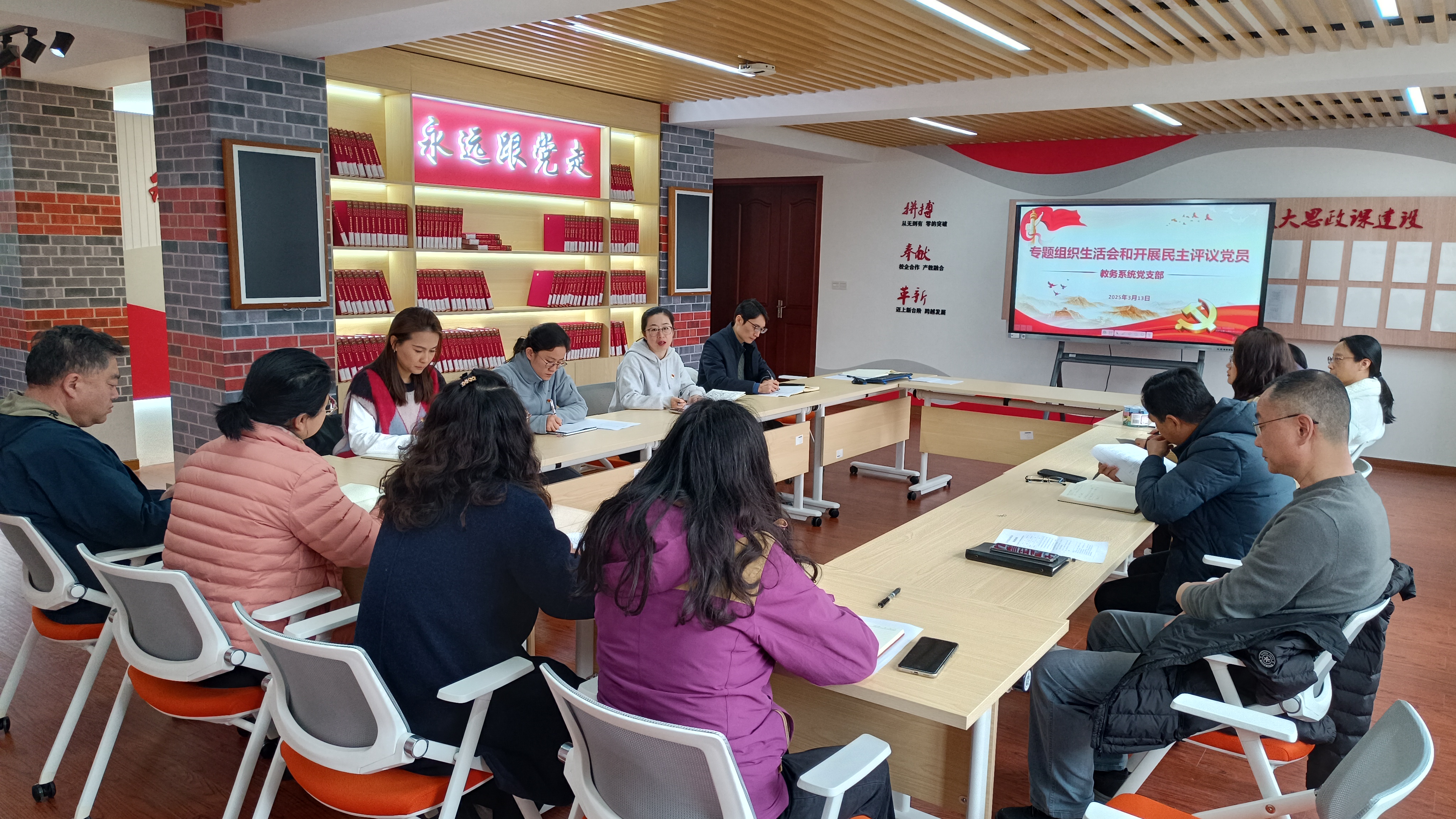 根据学校党委统一部署,3月13日下午,教务系统党支部召开专题组织生活会和开展民主评议党员,会议由支部书记俞婕主持。
