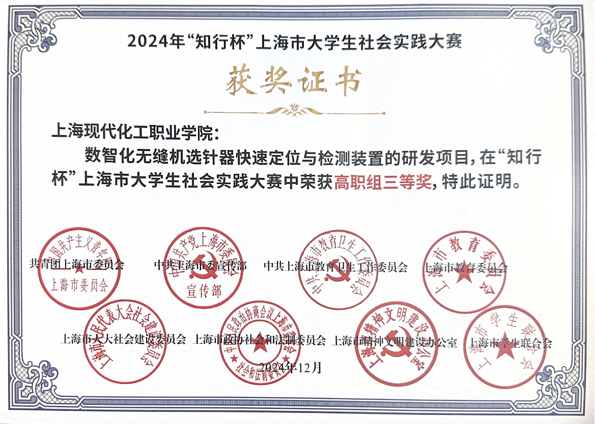 近期,喜讯传来,我校《数智化无缝机选针器快速定位与检测装置的研发》斩获了知行·科技创新赛道高职组的三等奖,汤豪杰老师获优秀指导老师,王翔、张文静同学获先进个人,实现我校在该赛项中零的突破。