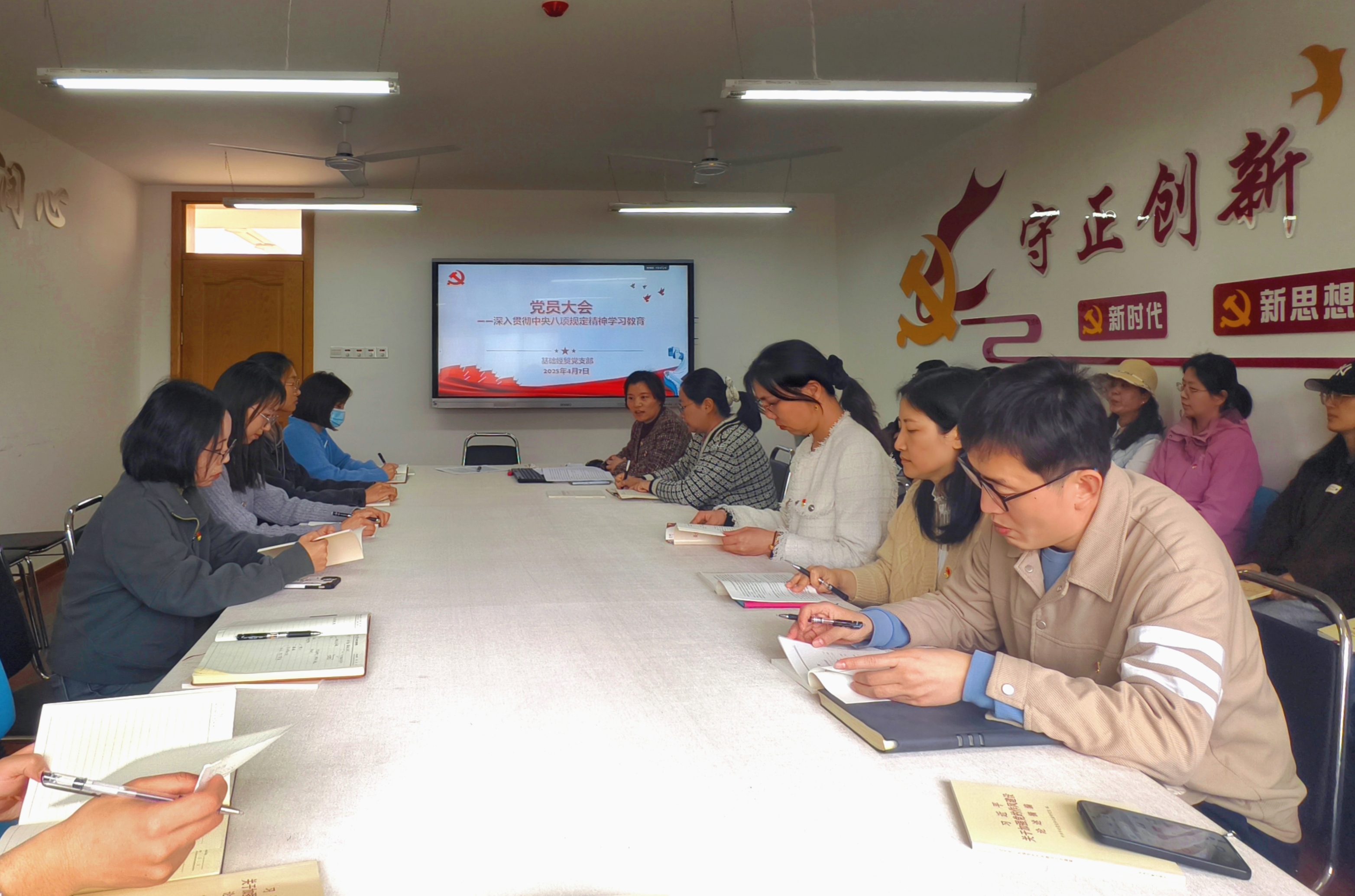4月7日,基础经贸党支部在C区407召开深入贯彻中央八项规定精神学习教育专题学习会。支部书记于燕娜传达了近期的工作提示,并结合学校和支部实际情况,对开展学习教育的具体举措向与会党员进行了进一步解读与沟通。
