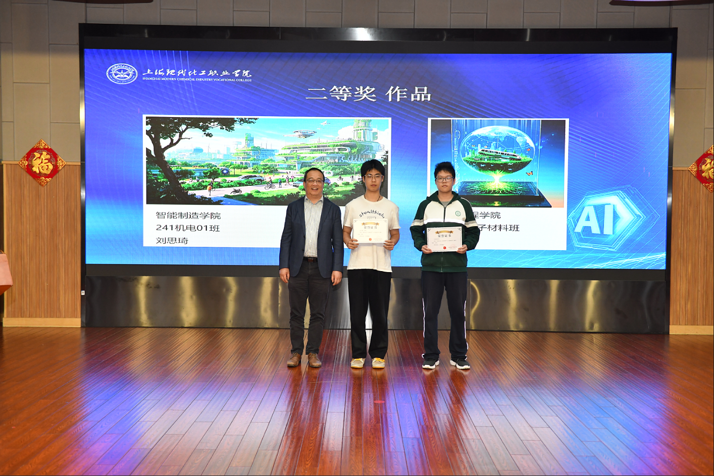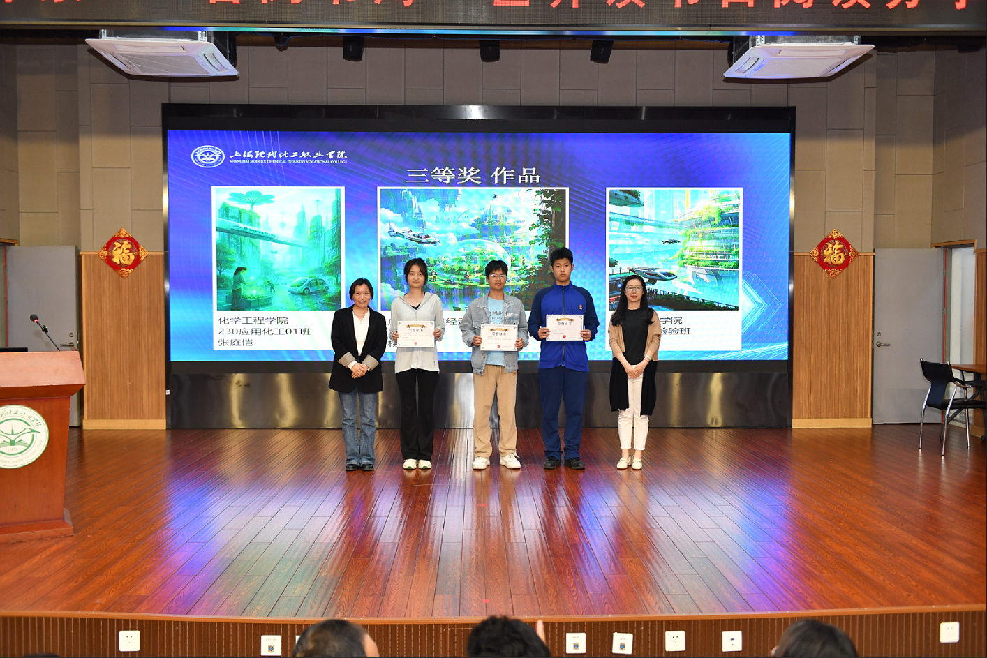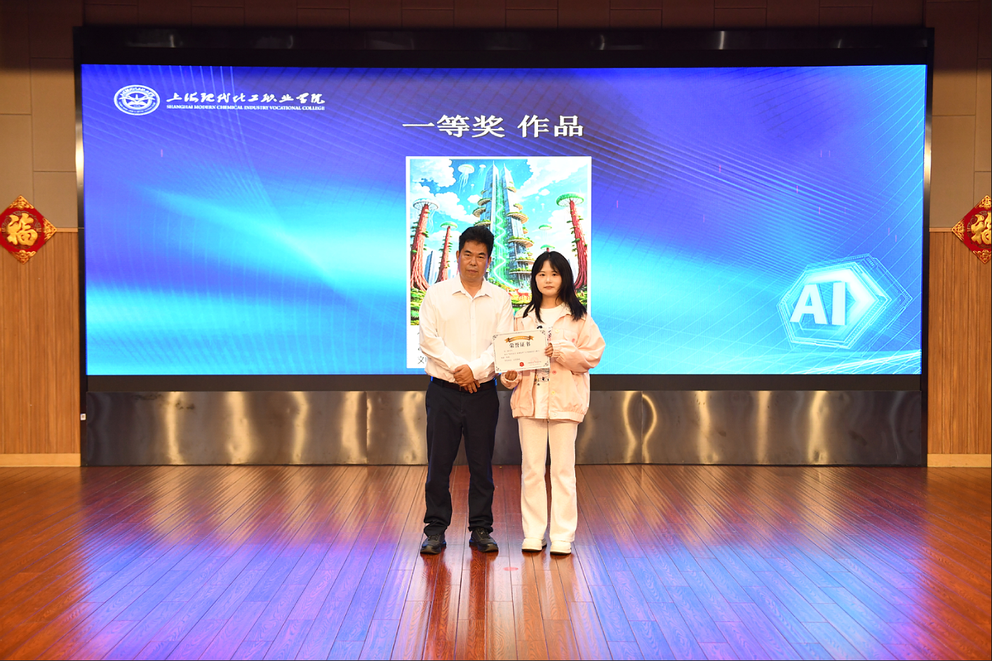 为鼓励学生运用AI技术创作兼具艺术价值与环保理念的作品,展现科技与可持续发展的融合可能,学校图书馆于3月-4月举行了“绿色安全 未来视界”AI绘画创作大赛。此次大赛共收到作品73件,参赛作品题材丰富,涵盖生态保护、绿色能源、智慧城市等领域,最终评选出一等奖1名、二等奖2名、三等奖3名,优秀奖20名,与会领导为获奖者颁奖。