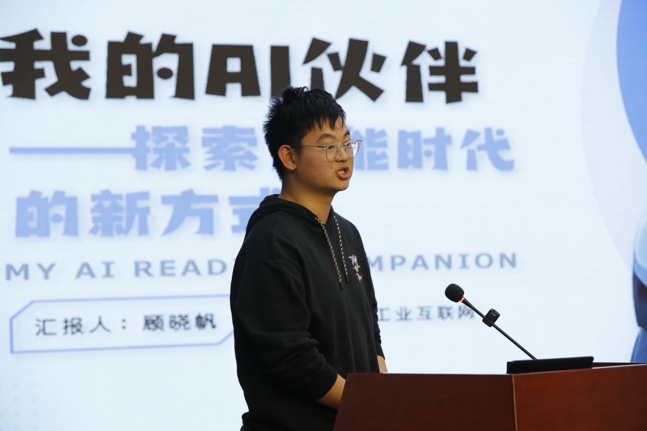 在AI应用分享环节,来自230工业互联网班的顾晓帆同学带来了干货满满的实践分享。他通过AI常用工具、应用实例为大家讲解了他与AI的相处之道。他在现场分享道:“在提示词中加入背景和具体要求,这样AI的推荐会更精准。”在与AI长期相处过程中,顾晓帆总结了三个学生使用AI工具的原则:主导权在我,AI是工具,决策永远属于人类;保持质疑,对AI输出必验证,思考不可替代;相互成就,用AI拓展认知边界,但保持独立思考。