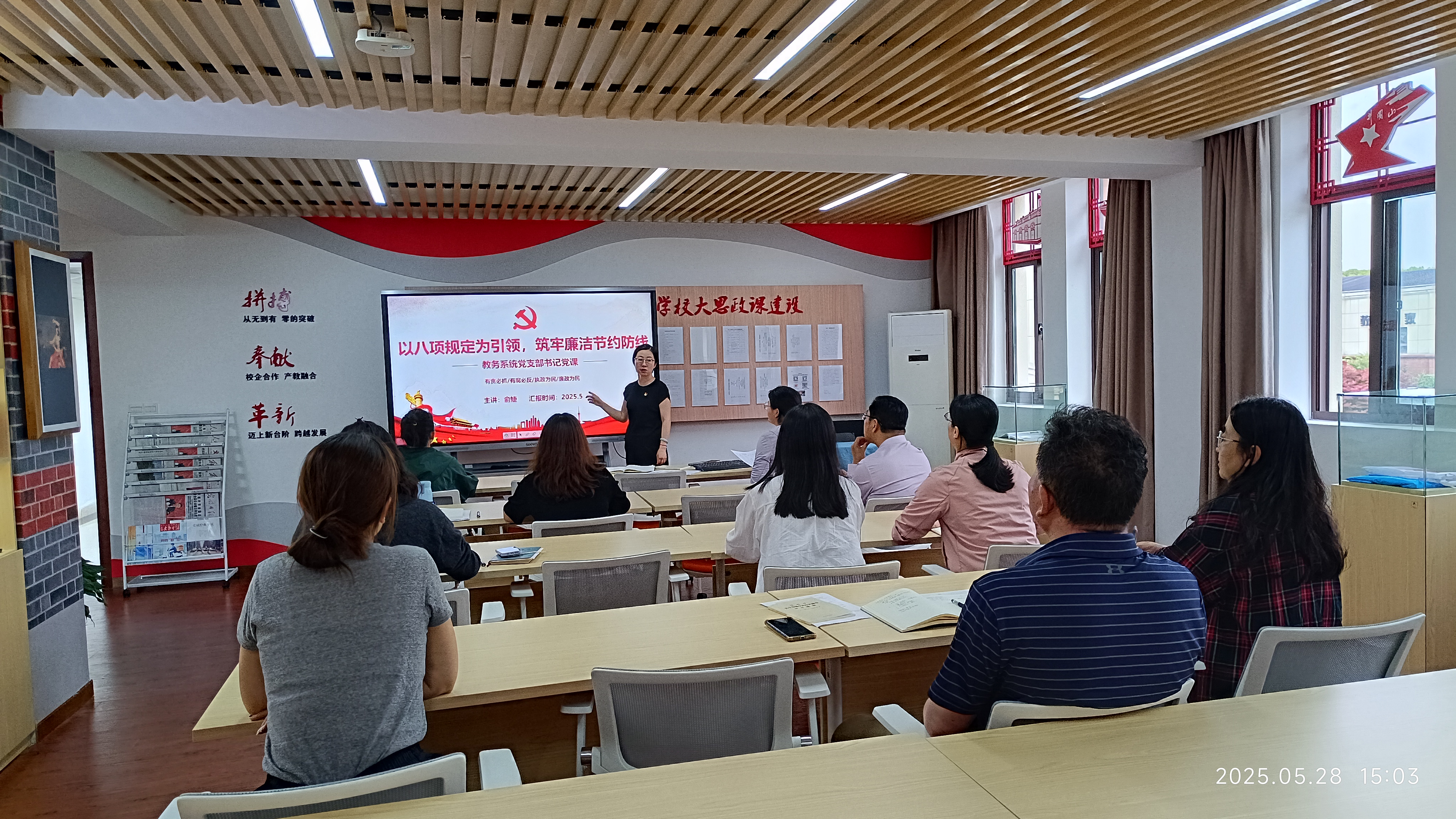 为进一步推动深入贯彻中央八项规定精神学习教育走深走实,按照学校党委统一部署,5月28日,教务系统党支部开展“支部书记上党课”活动。党支部书记俞婕以“以八项规定为引领,筑牢廉洁节约防线”为主题,为支部党员上党课。