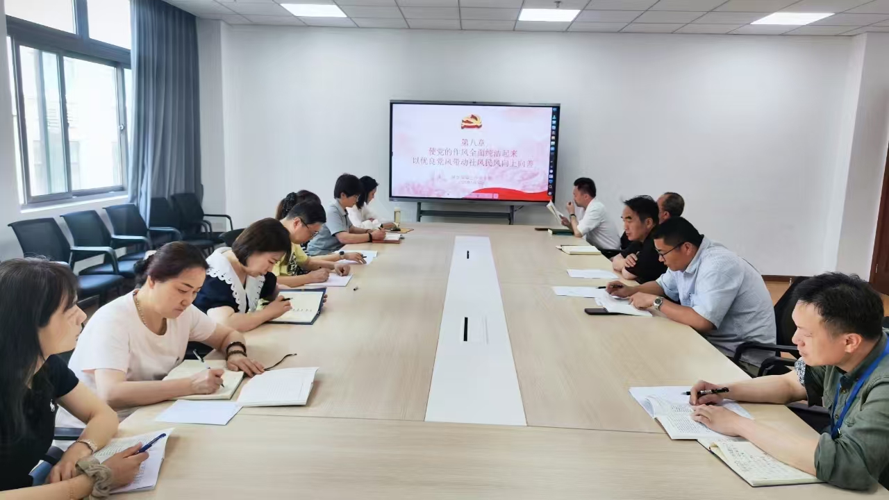 支委陈靖领学第八章《使党的作风全面纯洁起来,以优良党风带动社风民风向上向善》,号召全体党员要努力成为全社会的道德楷模,带头践行社会主义核心价值观,讲党性、重品行、作表率,以实际行动带动全社会崇德向善、尊法守法。