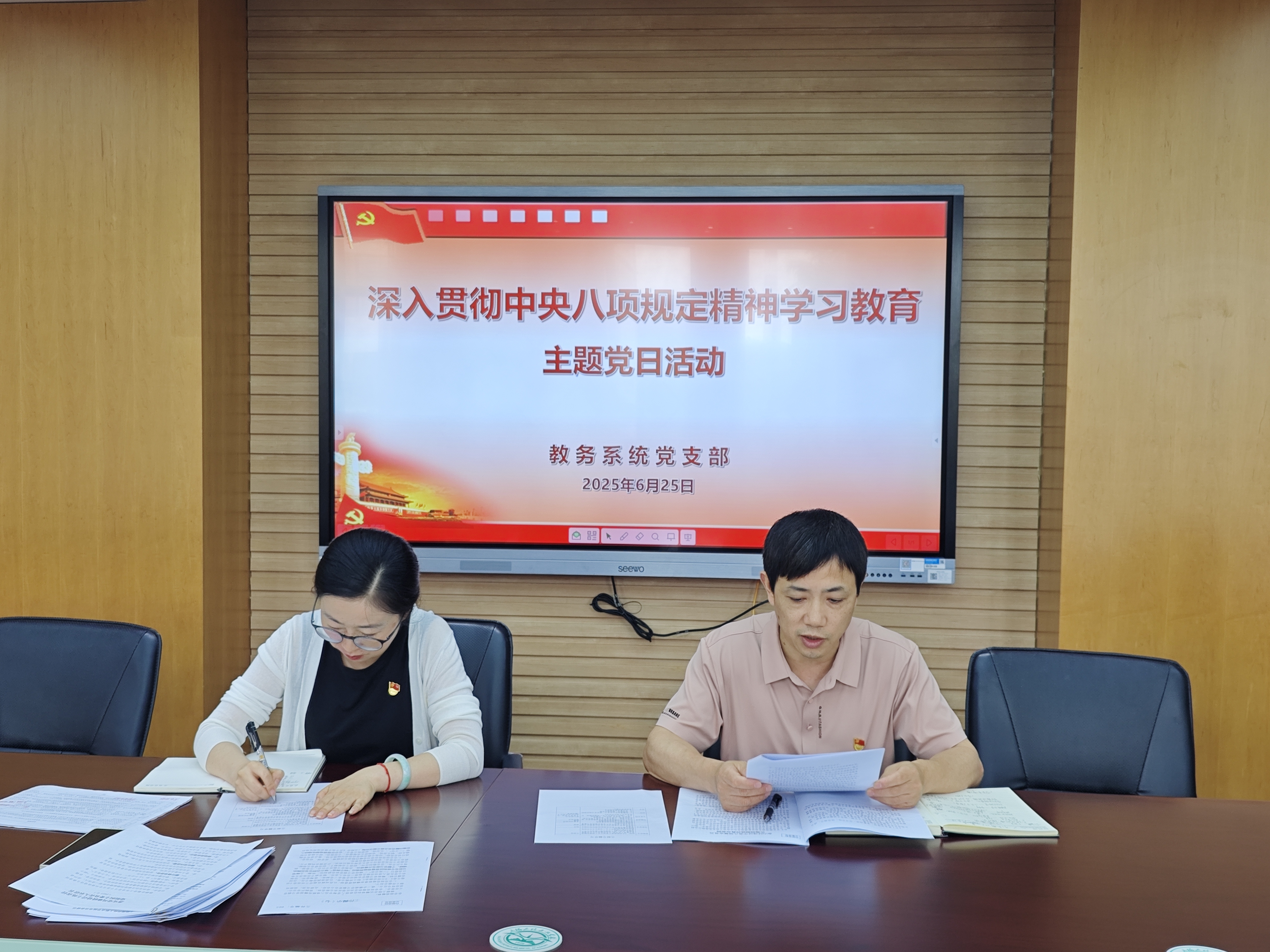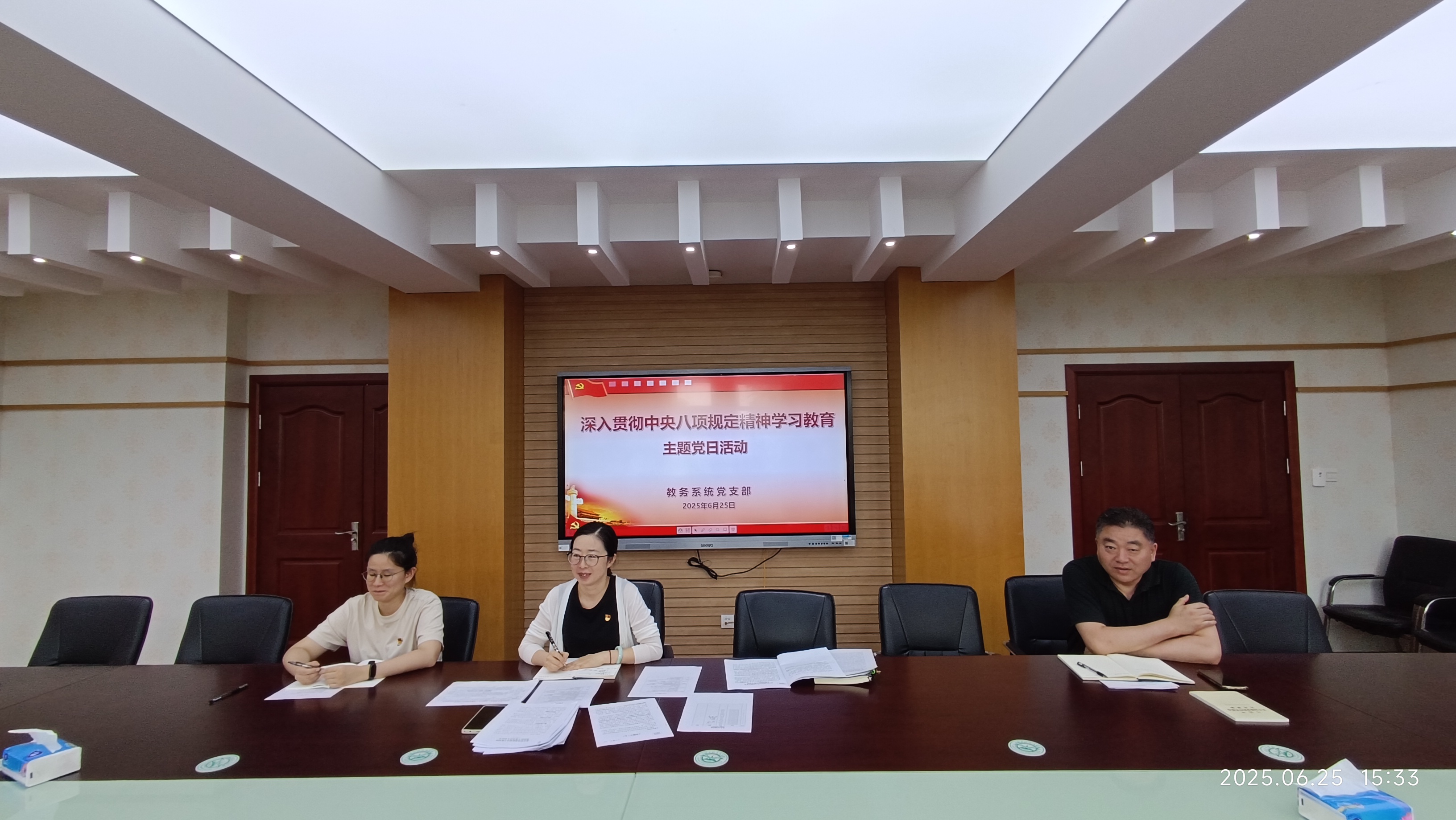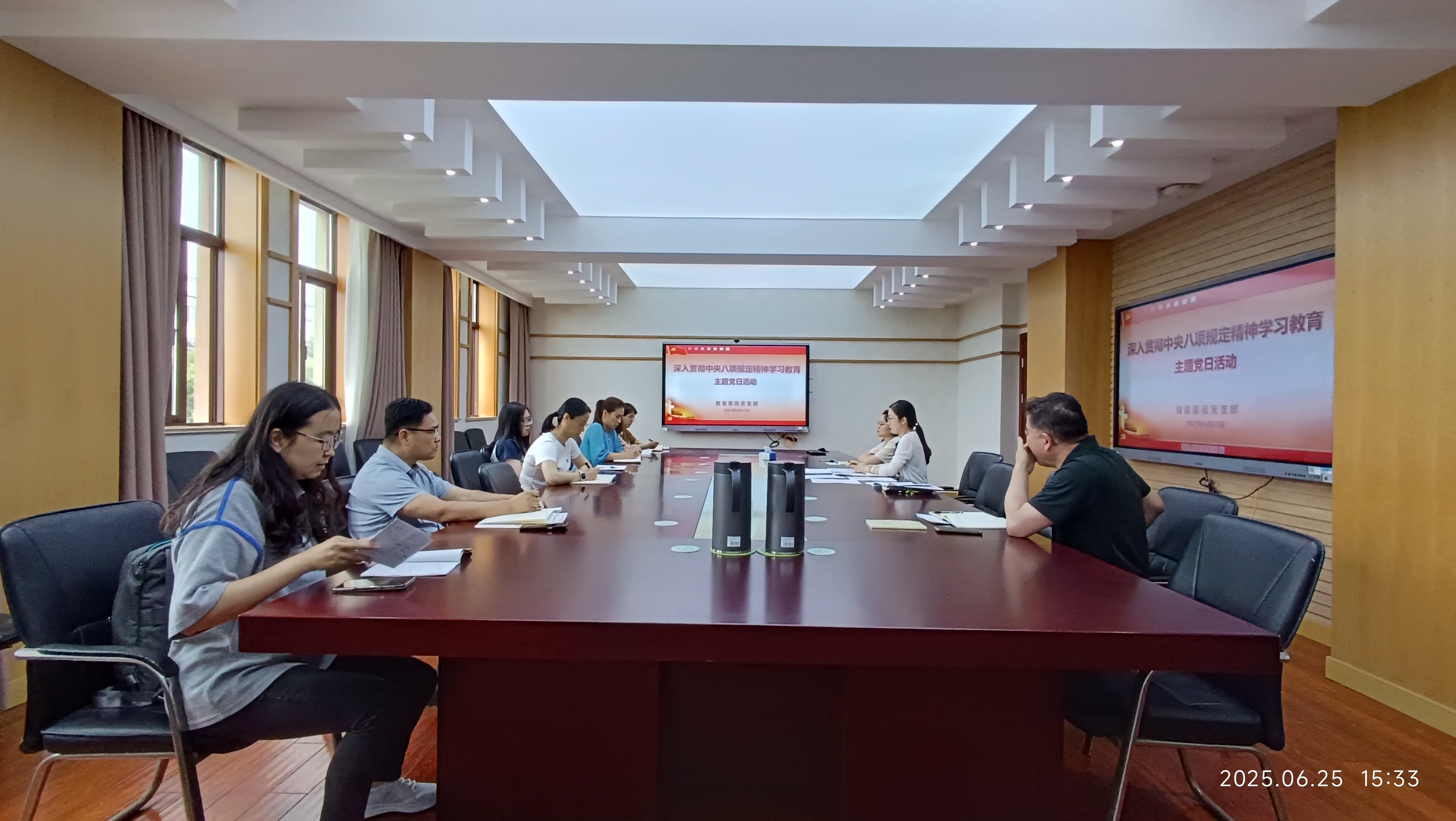 为深入学习贯彻习近平总书记关于深入贯彻中央八项规定精神学习教育的重要讲话和重要指示精神,根据相关工作要求,6月25日,教务系统党支部开展深入贯彻中央八项规定精神学习教育主题党日活动,活动由支部书记俞婕主持,全体党员积极参与。