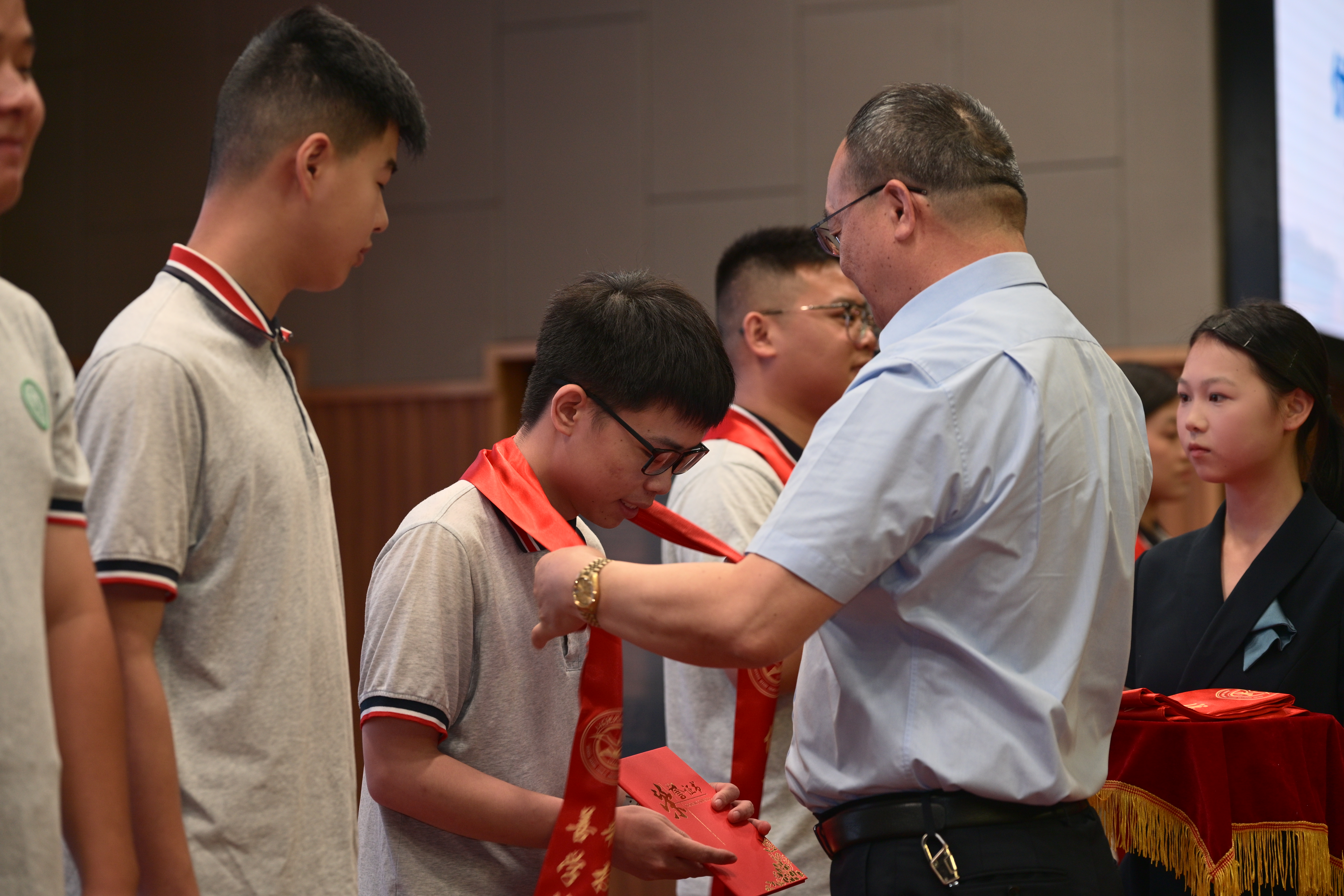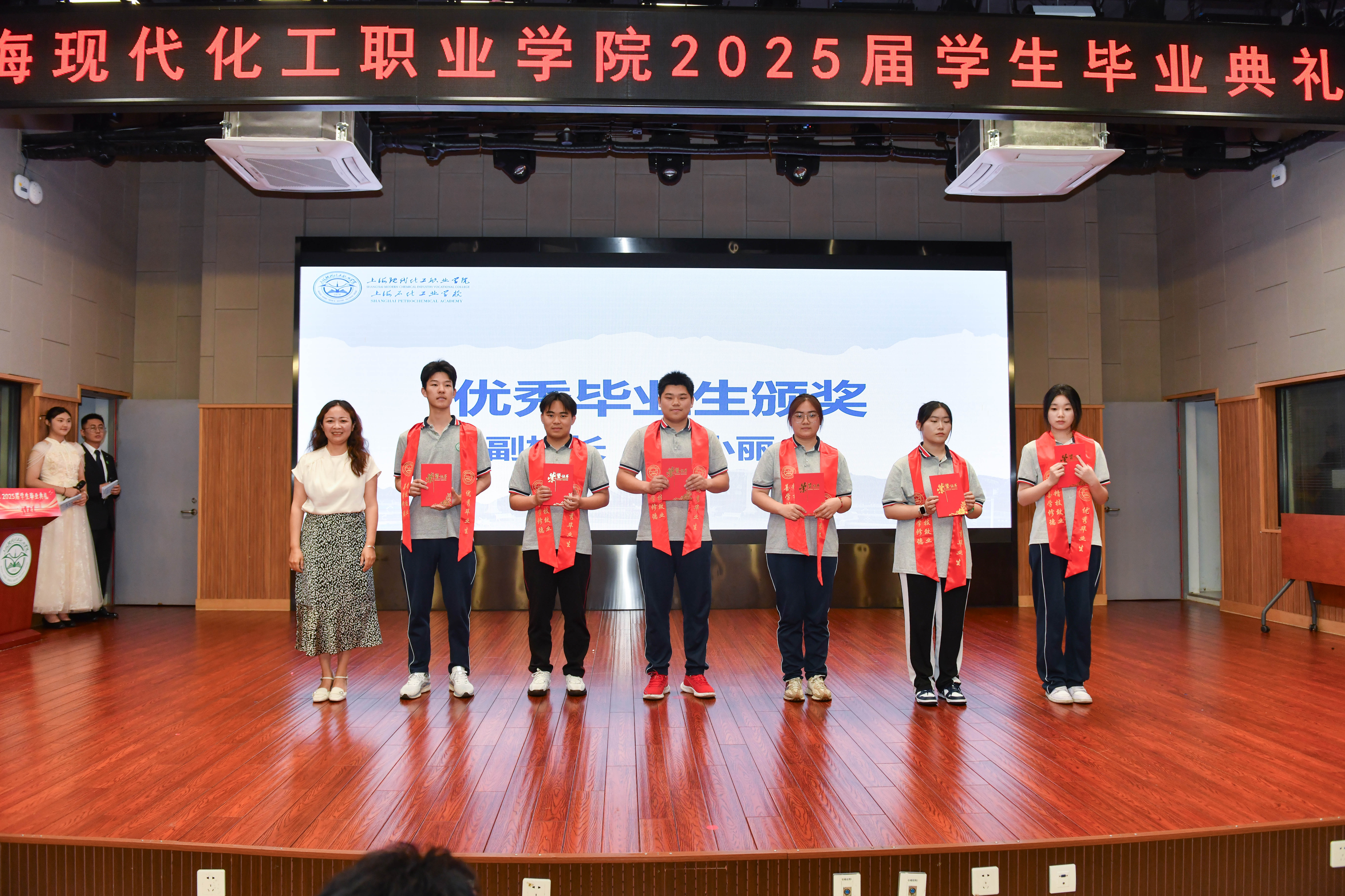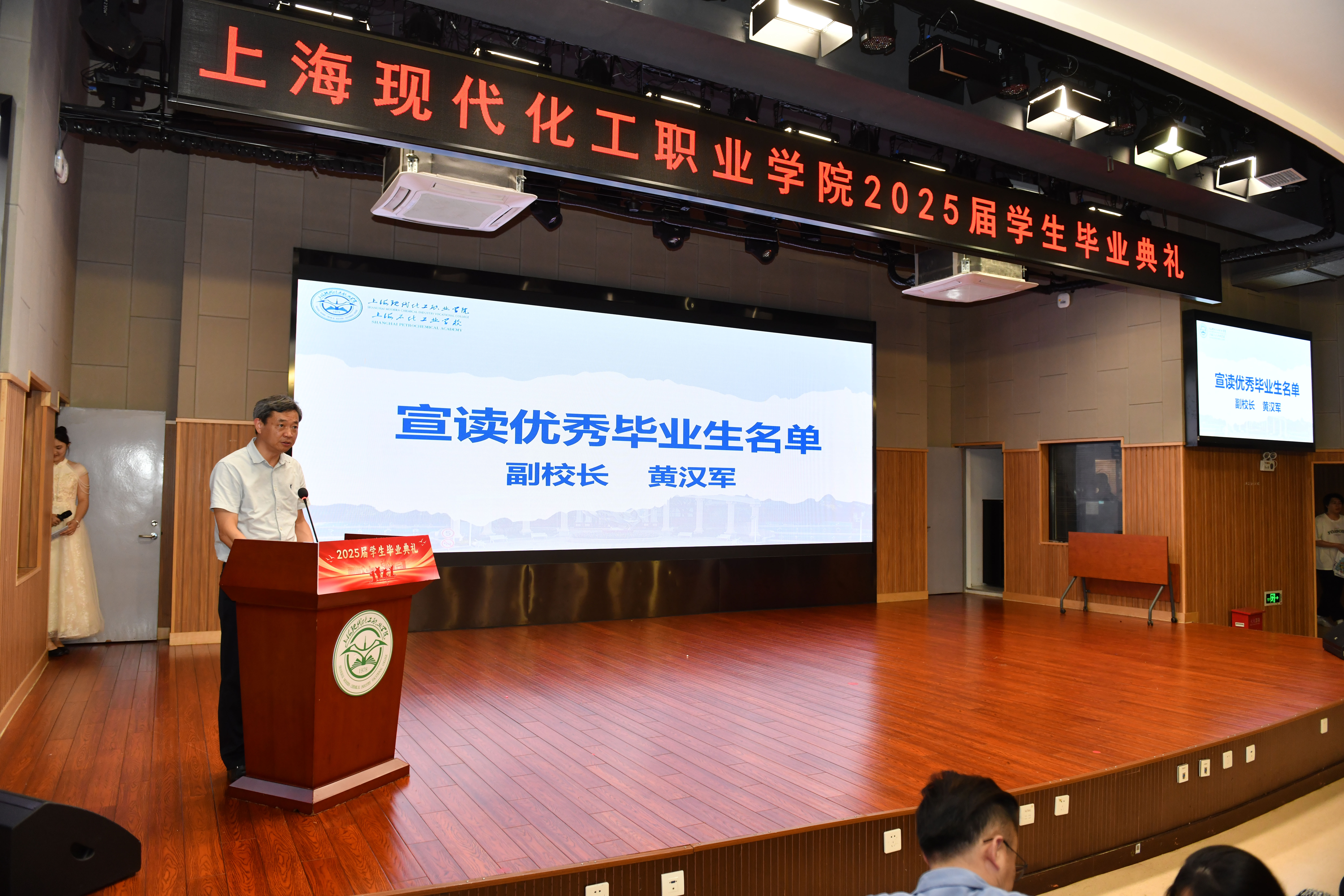 黄汉军宣布了本届优秀毕业生名单,严小丽、迮育彪为获奖学生颁发证书,佩戴绥带。