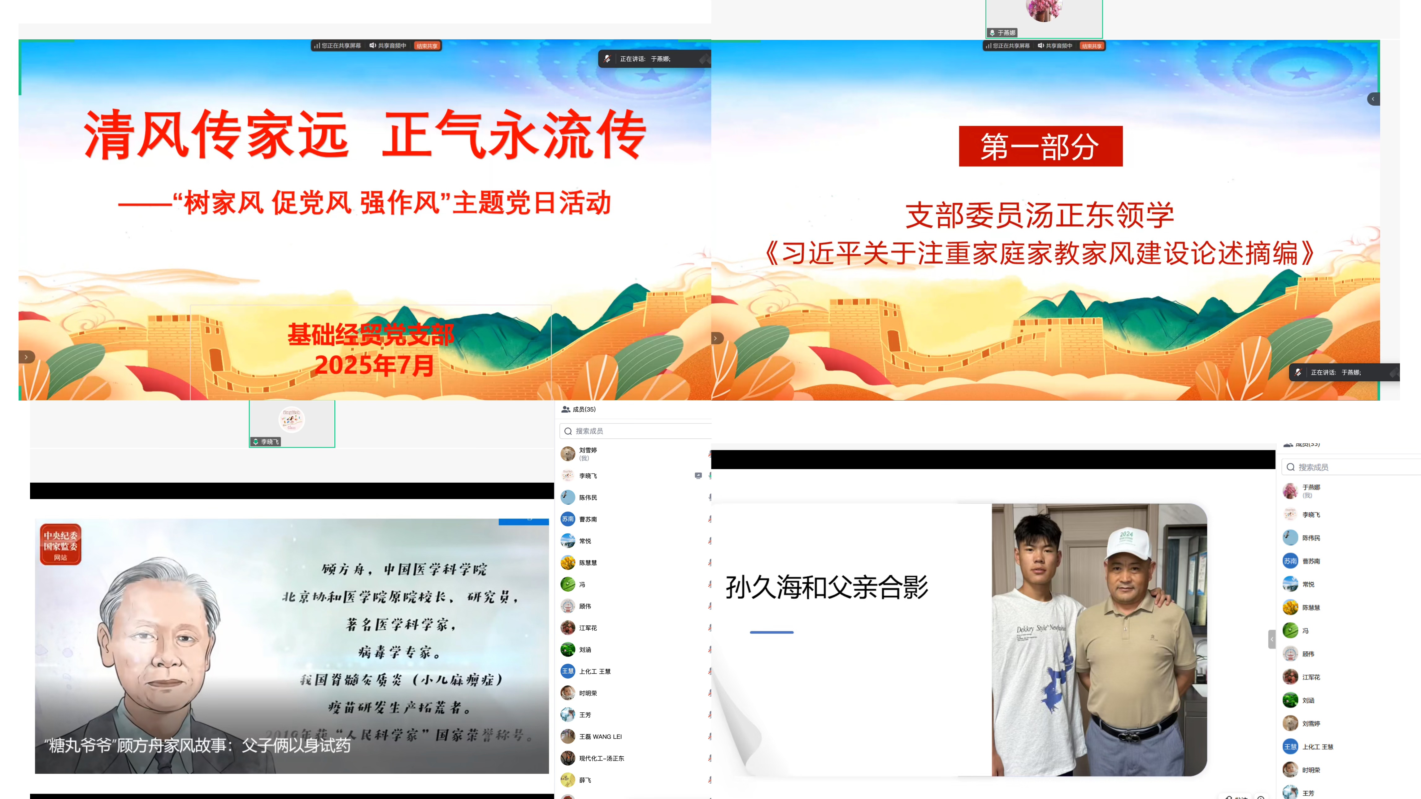 为深入传承和弘扬优良家庭家教家风,筑牢党员思想根基,推进作风建设走深走实,近日,基础经贸党支部以线上会议形式召开了“清风传家远 正气永流传”的7月份支部主题党日活动。活动由支部书记于燕娜主持,支部全体党员积极参与。
