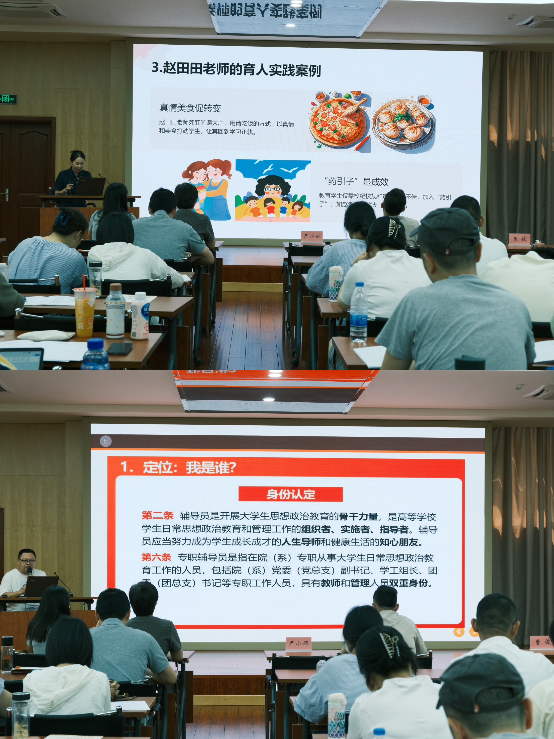 政策解读与实践经验并重,提升专业素养。校外专家杨慧深入解读了高校辅导员相关政策文件,从政策背景、核心内容和实施要求等方面进行了系统阐述,帮助大家更好地理解政策精神,明确工作方向。赵田田则结合多年班级管理经验,分享了丰富的育人实践案例,为参训人员提供了可借鉴、可操作的宝贵经验。