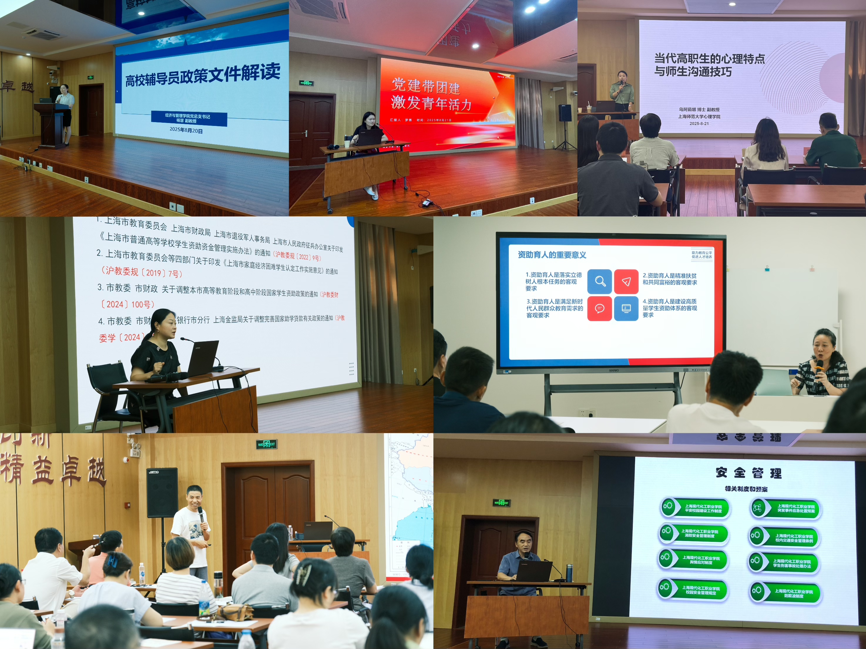 关注心理健康,筑牢安全防线。校外专家乌阿茹娜开展《当代高职生的心理特点与师生沟通技巧》讲座,帮助我校教师了解学生心理特点,识别心理问题,掌握应对方法,着力提升班主任、辅导员队伍工作的针对性和实效性。心理中心江芯竹对近期学生心理普测情况进行分析,帮助辅导员、班主任更好地了解学生心理健康状况,及时发现问题并进行干预。 校外专家费志杰以“践行总体国家安全观,共筑校园安全防线”为题,强调了国家安全的重要性,并就如何加强校园安全防范工作进行了深入讲解。潘志东则对学校安全管理制度进行了详细解读,帮助大家进一步明确安全责任,提升安全意识。