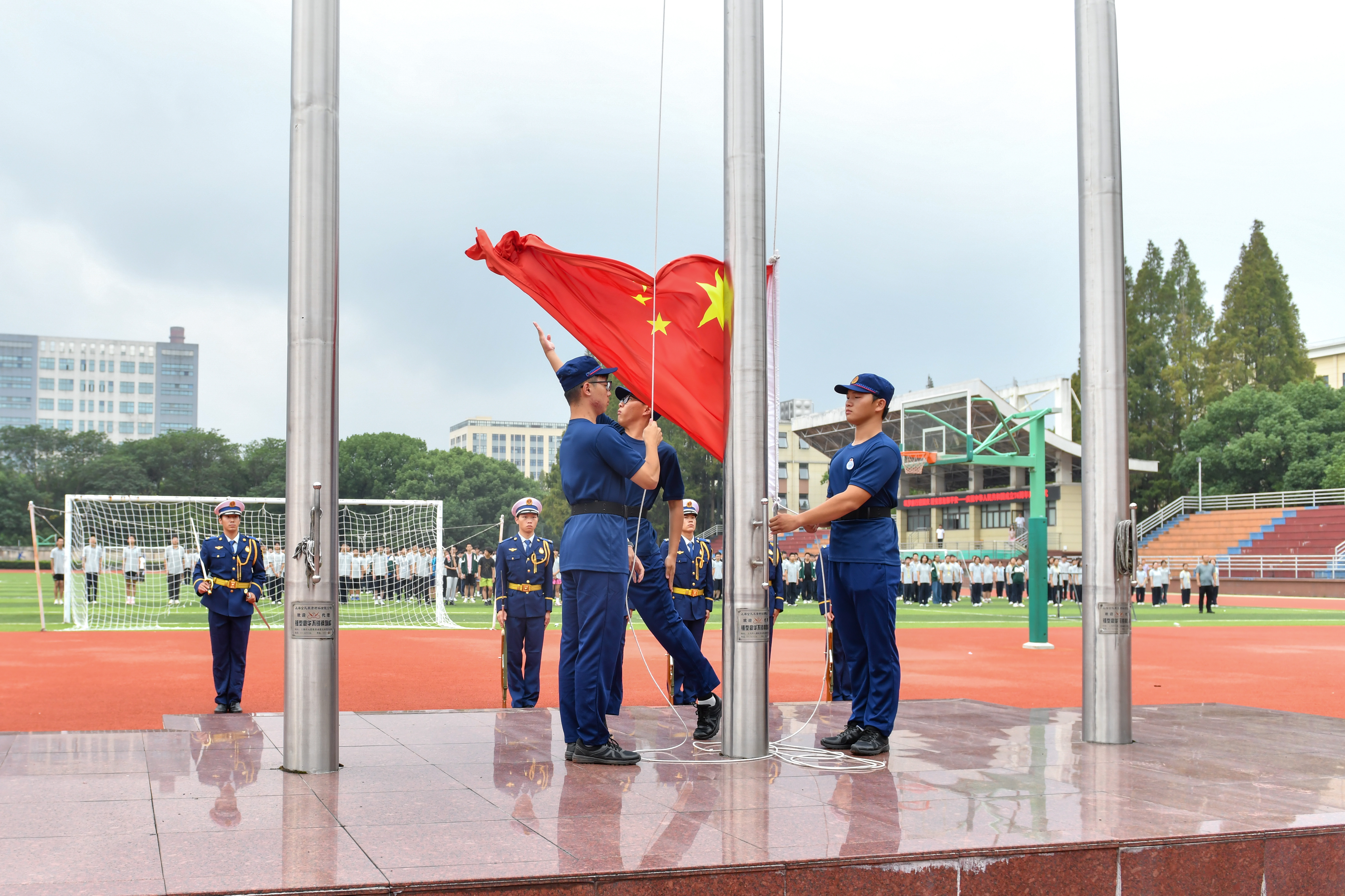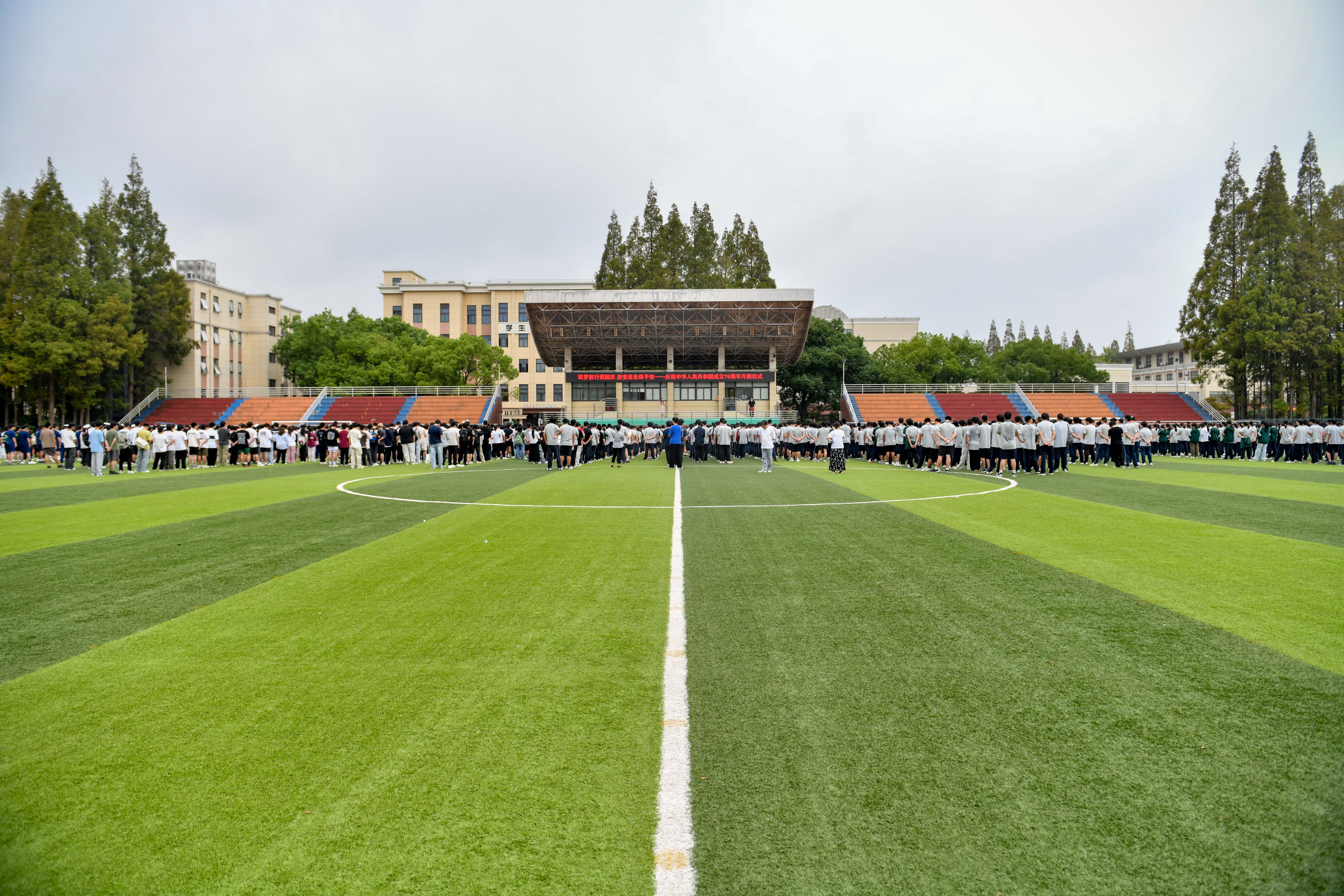 仪式伊始,伴随着雄壮激昂的《义勇军进行曲》,鲜艳的五星红旗在全体学生的注目下冉冉升起。同学们神情肃穆,满怀崇敬与自豪,向国旗行注目礼,共同祝福祖国生日快乐。