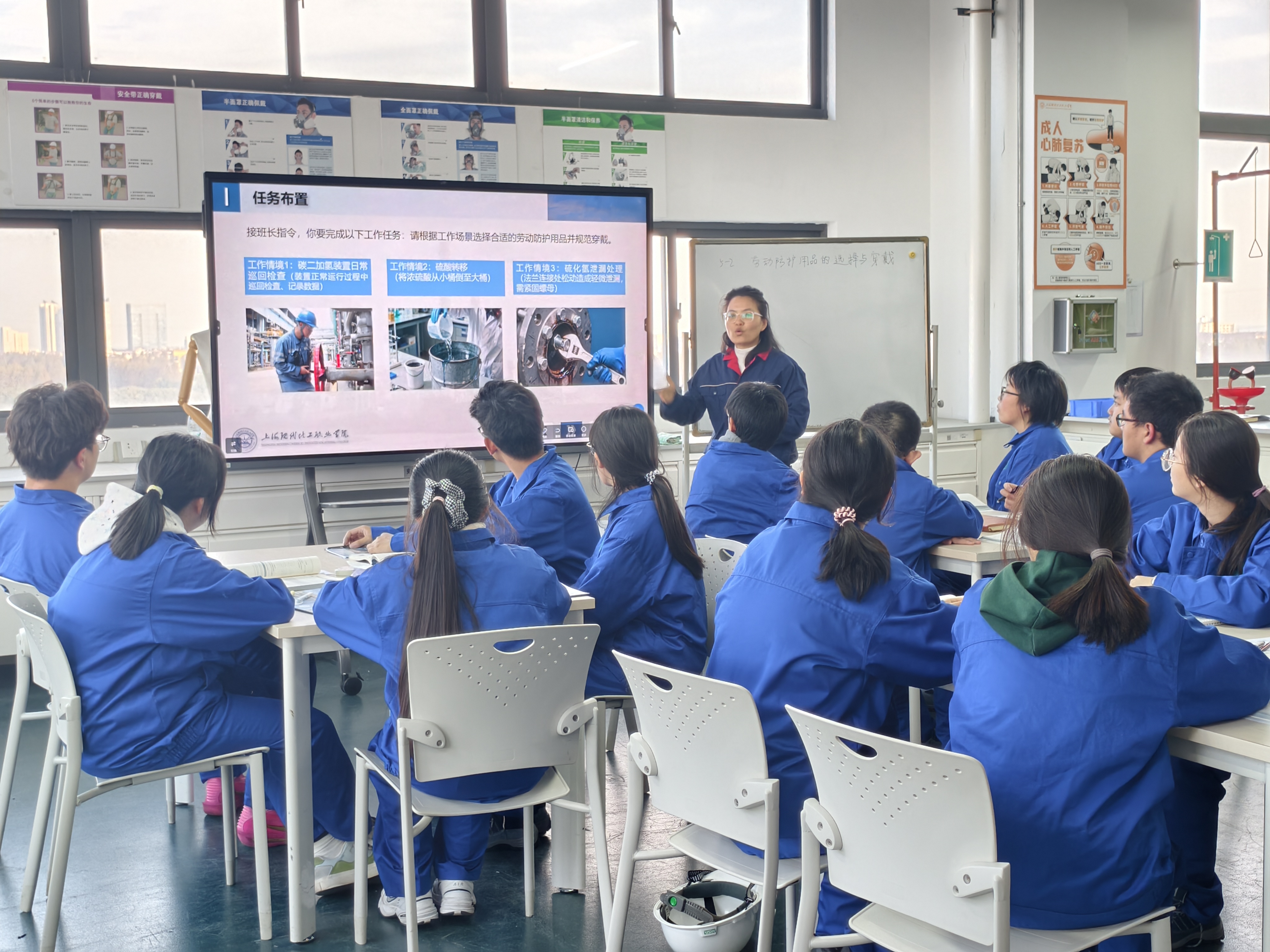课上,牛亚杰以真实化工生产场景为切入点创设工作情境,创新采用“线上平台辅助+线下实操落地”的混合教学模式,通过“风险辨识—用品选择—规范穿戴—综合评价”的沉浸式教学流程,让学生深度参与实践。围绕碳二加氢装置日常巡检、硫酸转移、硫化氢泄漏处理三大典型工作情境,引导学生分组开展风险辨识与防护用品选择讨论;实操展示环节,各小组分工协作,完整呈现用品检查、规范穿戴的全流程,教师现场点评指导,纠正穿戴过程中的细节偏差,强调“PPE是安全防护最后一道防线”。