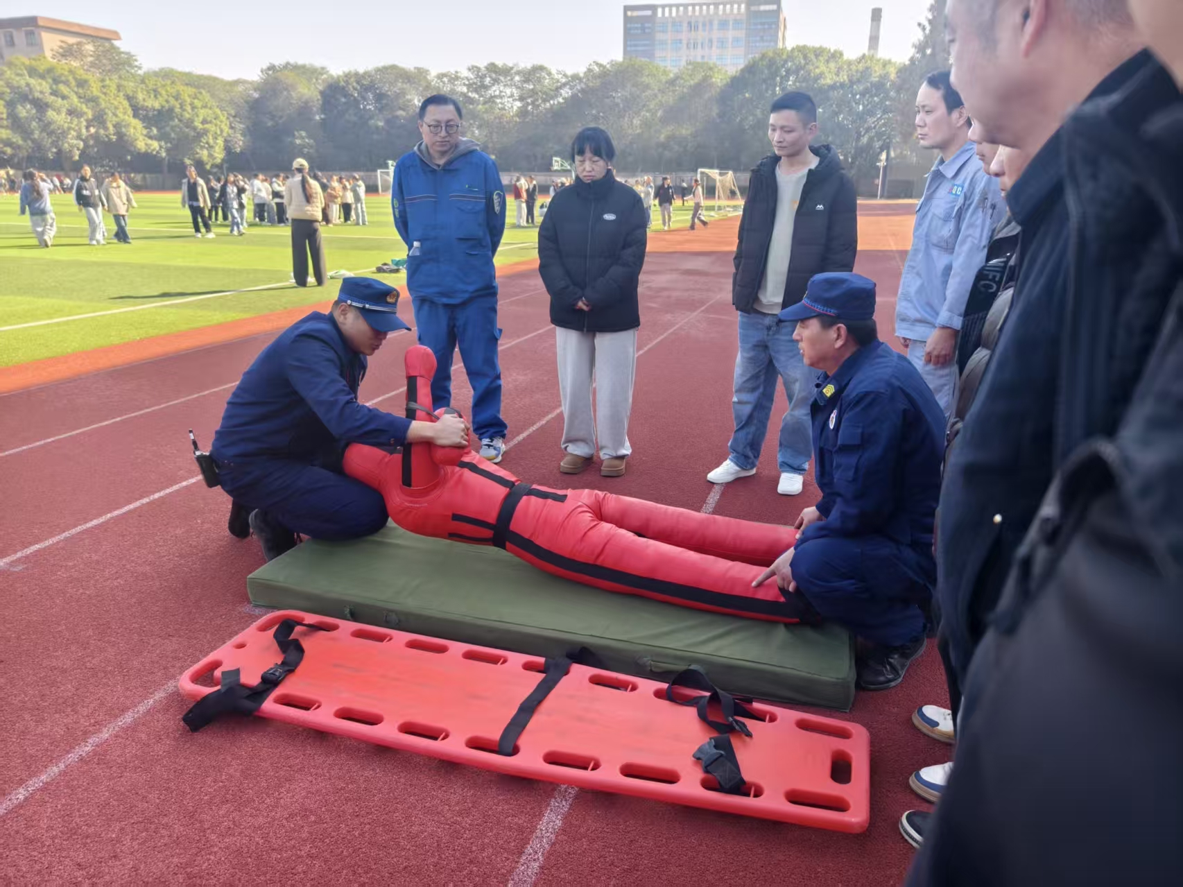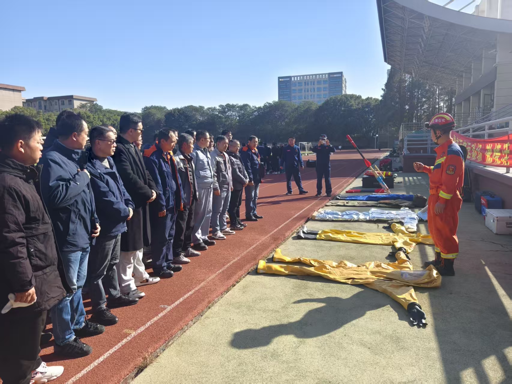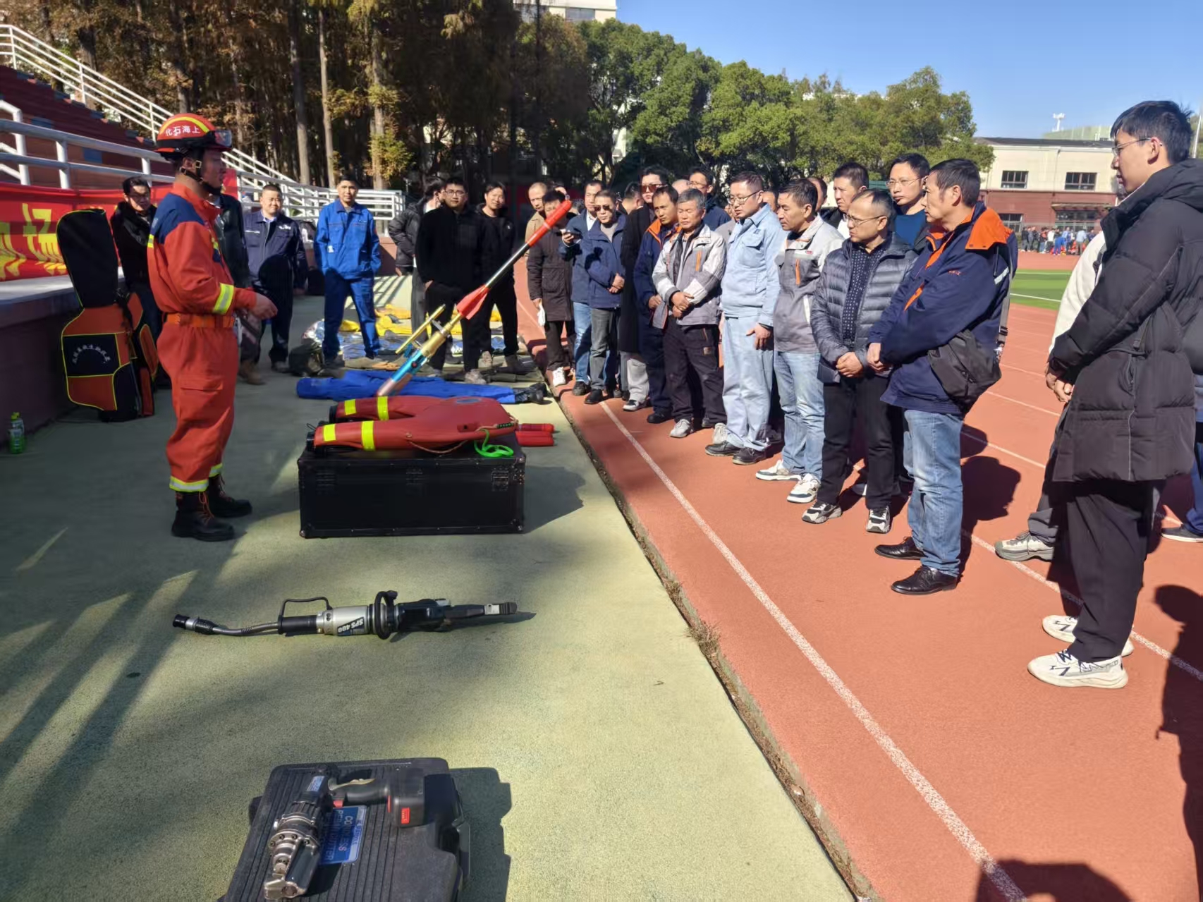 下午的实操训练在北校区操场有序开展。国家危化救援上海石化队作战参谋杨阳首先进行智能应急装备展示,直观呈现检测仪、堵漏工具等现代化器材的功能与操作规范;随后,在副总工程师吴志勇的指导下,参训队员分组开展实战演练。危化品泄露情境中,队员们默契配合完成通道开辟、伤员转运、现场施救等连贯操作;堵漏实操环节,大家熟练运用专业工具,针对不同类型泄漏点精准完成封堵作业,切实提升实战处置能力。