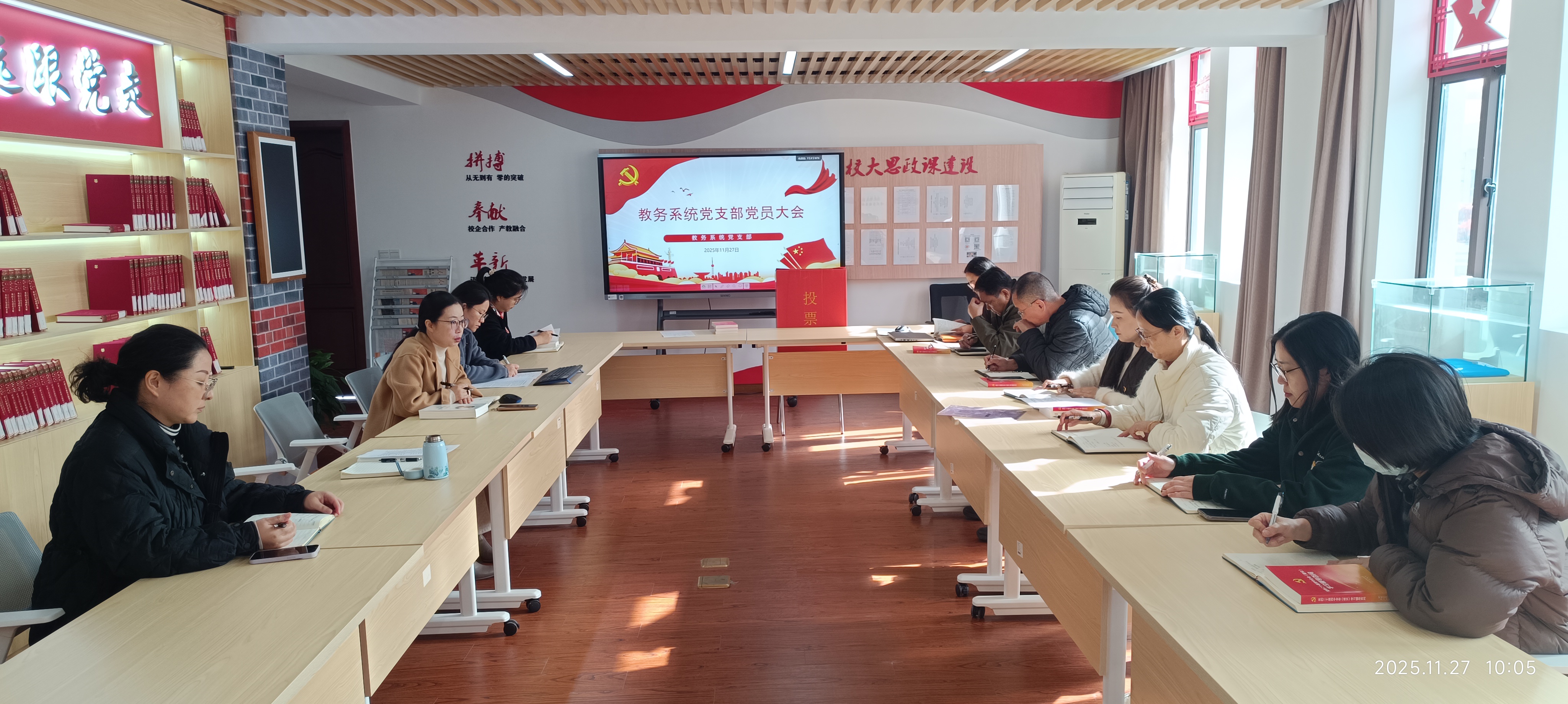 11月27日上午,教务系统党支部召开支部党员大会,以专题学习与换届筹备相结合的形式,推动理论学习走深走实,为支部建设注入新动能。全体党员参加会议,会议紧扣学习贯彻党的二十届四中全会精神主线,有序推进各项议程。