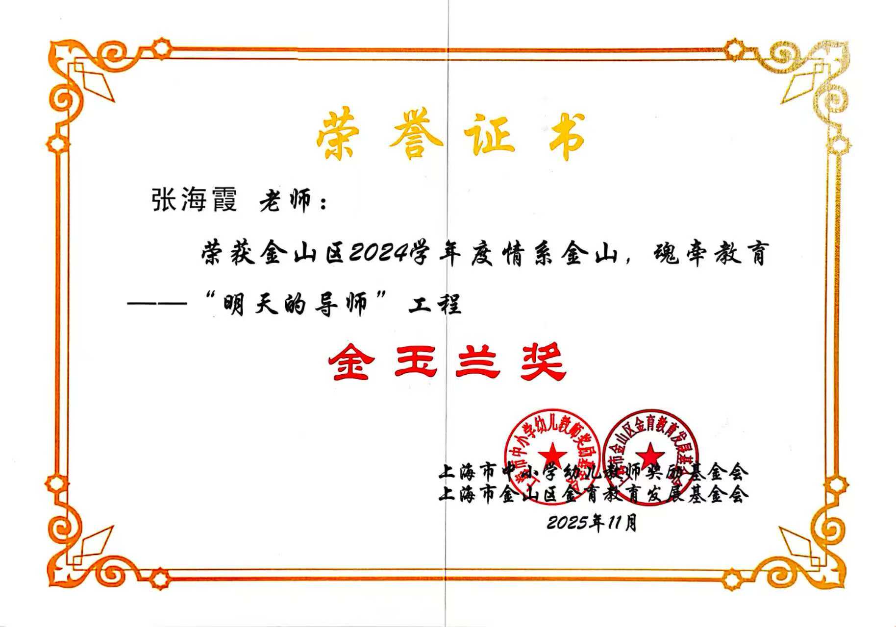 12月3日,“情系金山 魂牵教育”金山区“明天的导师”工程2024学年优秀人员表彰暨工作推进会在区教育学院举行,我校5位教师喜获佳绩,其中严小丽、张海霞获“金玉兰奖”,董少娣、牛亚杰、康静宜获“金苗奖”。