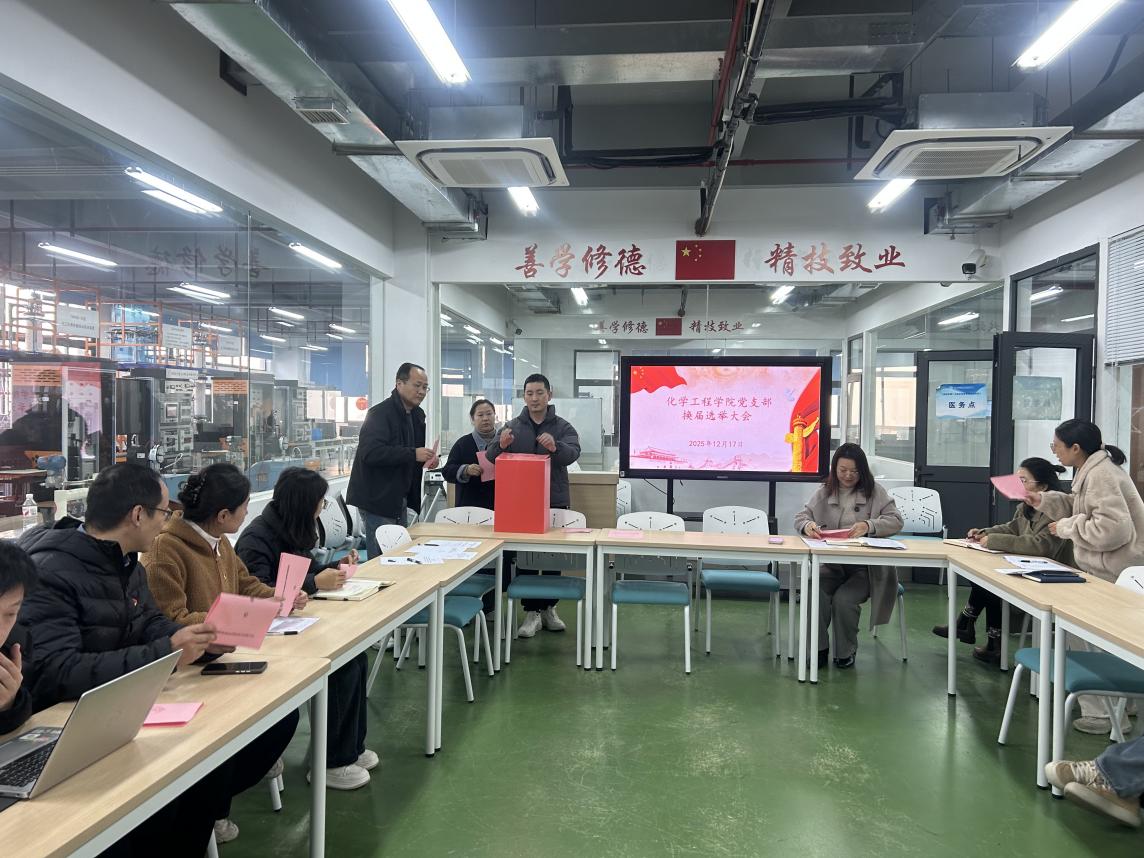 12月17日,化学工程学院党支部严格遵照《中国共产党章程》《中国共产党基层组织选举工作条例》及上级党委部署要求,历经筹备部署、推荐考察、大会选举、分工履职等全流程规范操作,顺利完成党支部委员会换届选举工作。党员大会在化工实训大楼1020会议室召开,应到党员25名、实到21名,符合选举法定要求。会议由胡迪君主持。