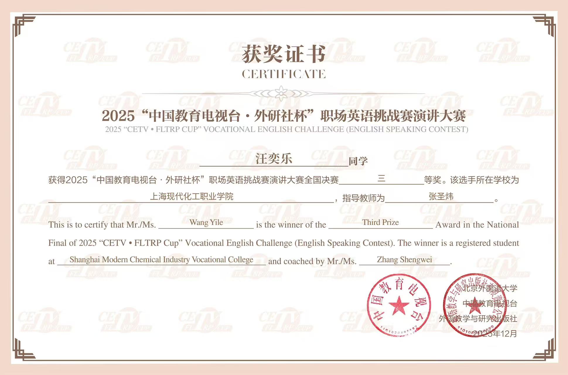 捷报再传,续写新篇。在刚刚落幕的2025年“外研社杯”职场英语挑战赛演讲大赛全国总决赛中,历经上海赛区特等奖的淬炼,我校250工业互联网1班的汪奕乐同学代表上海赛区与全国顶尖学子同台竞技,最终荣获全国总决赛三等奖,展现了稳健扎实的综合素养与沉着从容的竞赛风采。