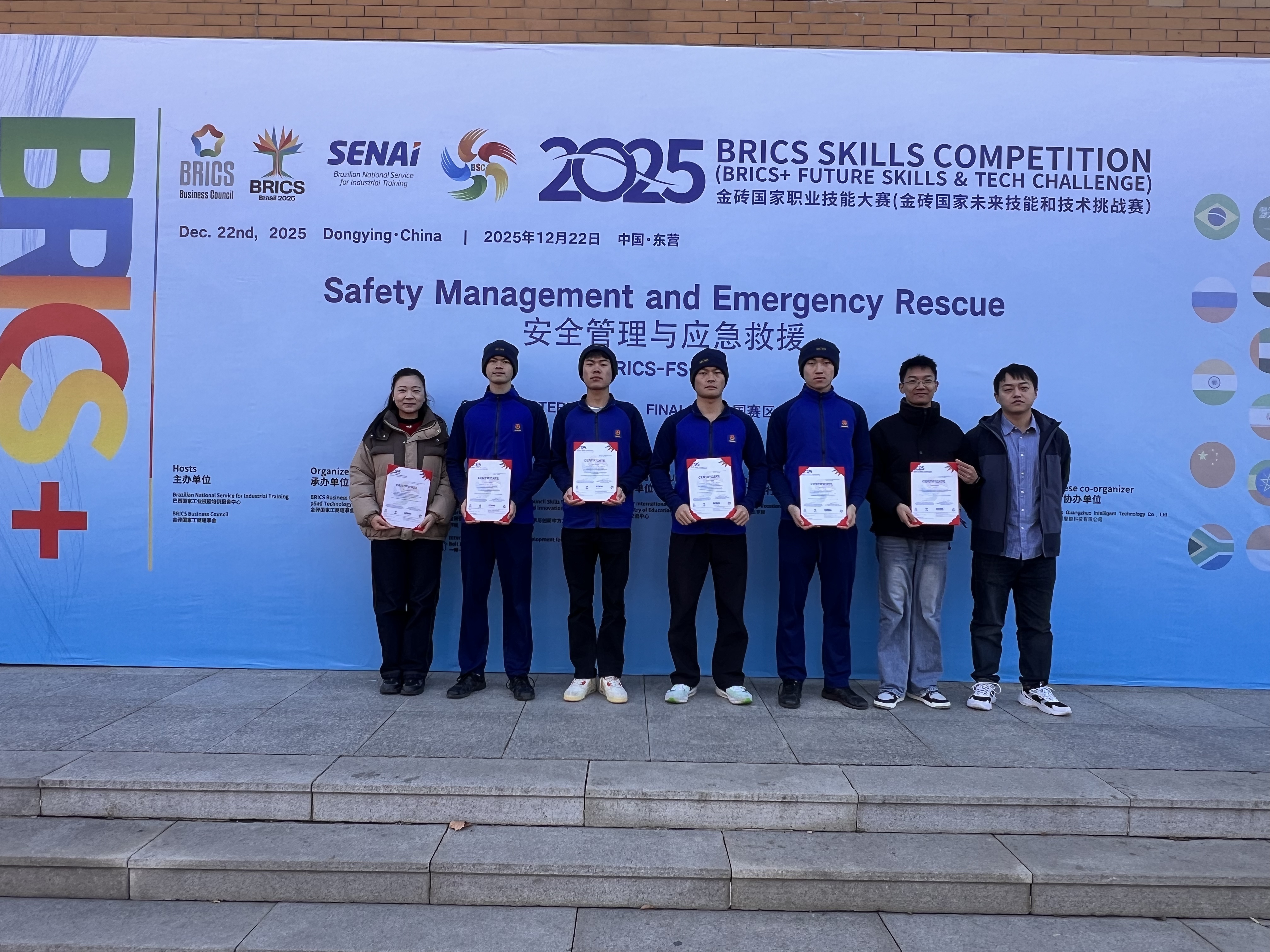 12月25日,2025金砖国家职业技能大赛安全管理与应急救援赛项国际总决赛在山东东营职业学院圆满落幕。我校消防救援技术专业参赛团队从来自中国、俄罗斯、印度等10余个国家的78支队伍中脱颖而出,凭借扎实的专业功底与出色的实战表现斩获二等奖。