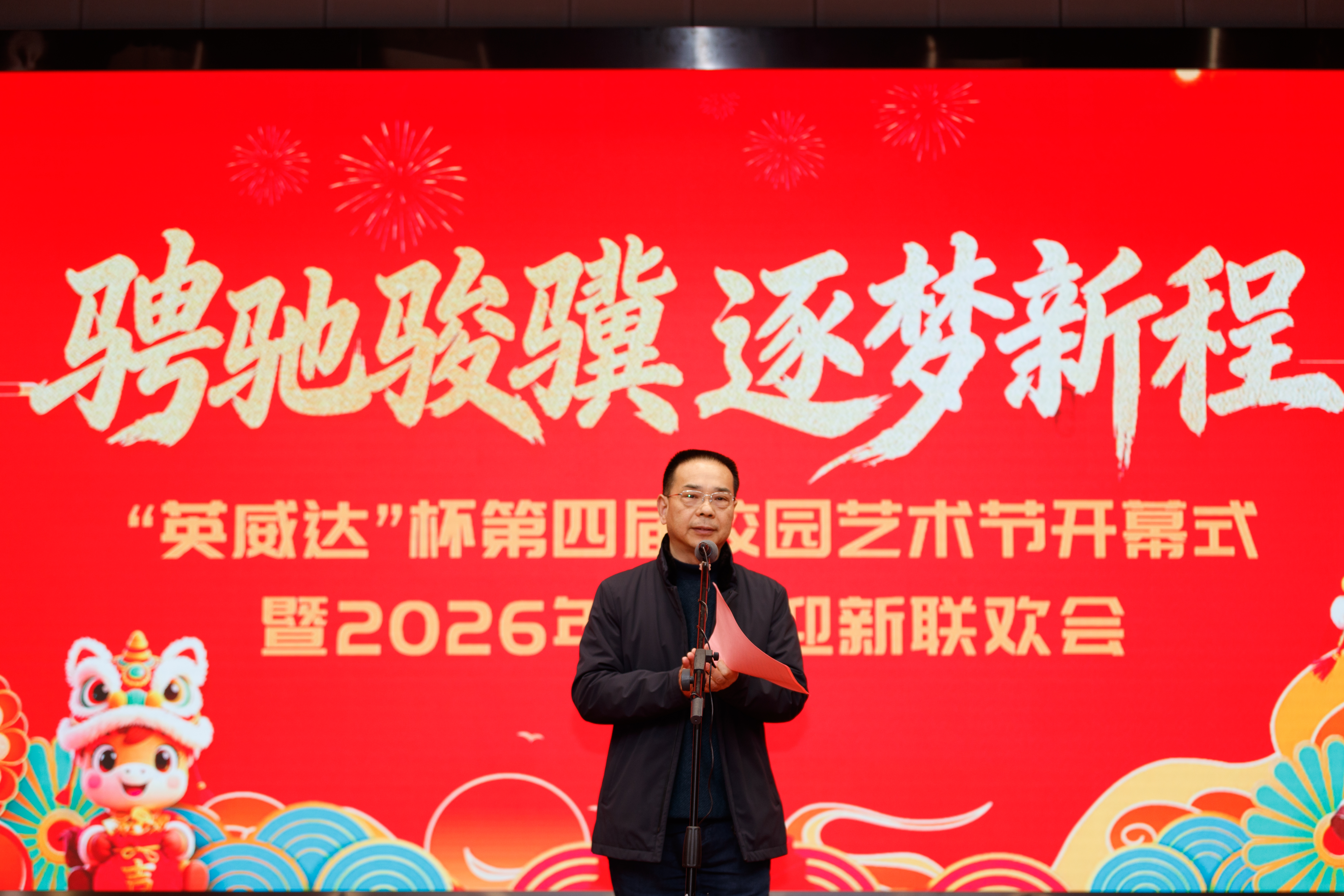 金蛇回首辞旧岁,骏马奔腾迎新年。12月31日下午,我校“英威达”杯第四届校园艺术节开幕式暨2026年元旦迎新联欢会在校会议中心顺利举行。校党委书记高炬,副校长黄汉军、严小丽、张海霞,工会主席李雅娟,驻校警官李忠娣,各职能部门和二级学院负责人以及师生代表们欢聚一堂,辞旧迎新。