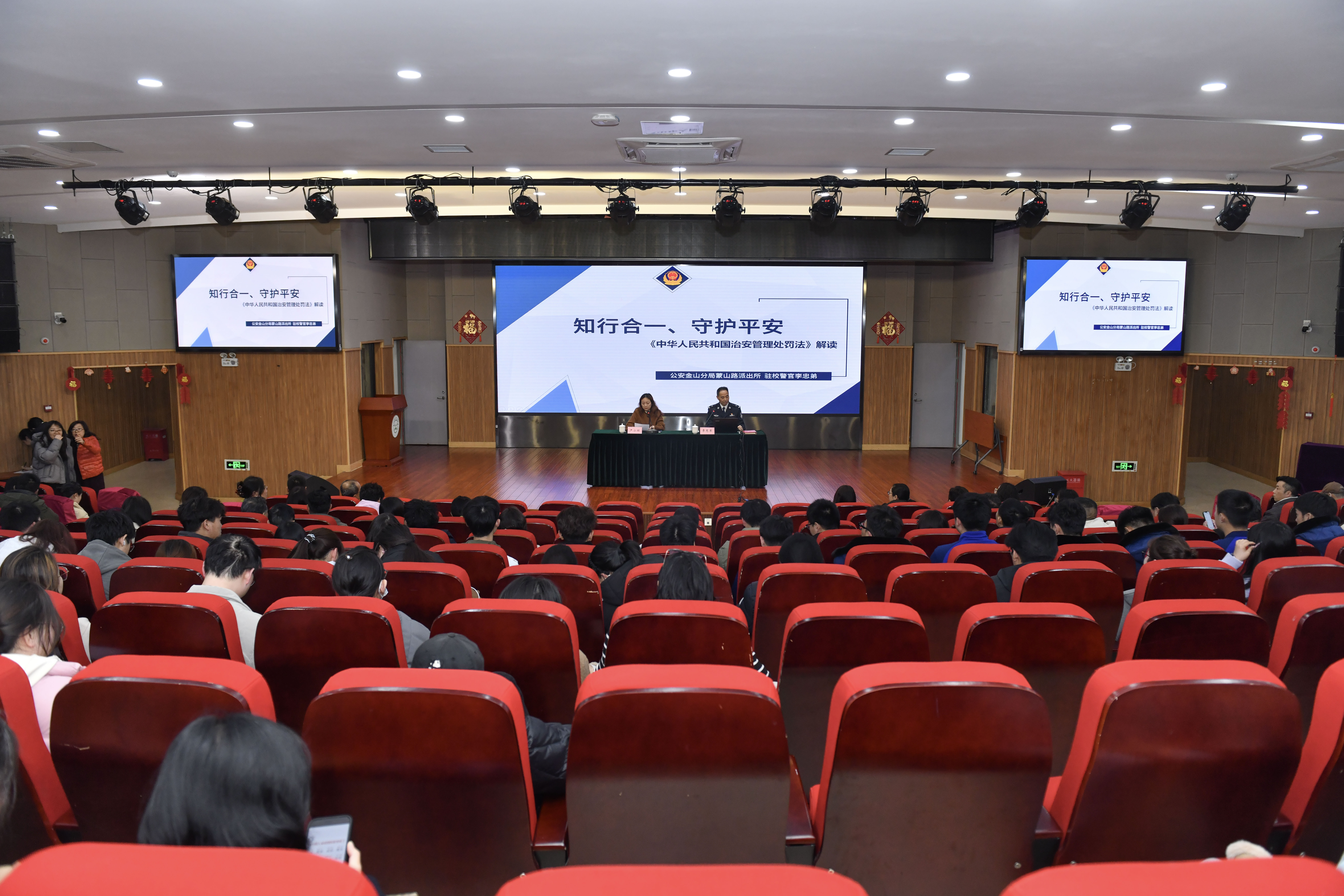 为深入学习贯彻2026年1月1日正式施行的新修订《中华人民共和国治安管理处罚法》,帮助广大师生精准把握法律修订要点、提升法治素养与自我保护能力,3月18日下午,我校安保处牵头组织“知行合一守护平安”专题法治讲座。分管学校安全工作的副校长严小丽主持活动,特邀驻校警官李忠弟担任主讲,全校教职员工、部门安全员、大学生平安志愿者在主会场集中学习,各班辅导员(班主任)及全体学生通过直播同步参与,实现普法教育全覆盖。