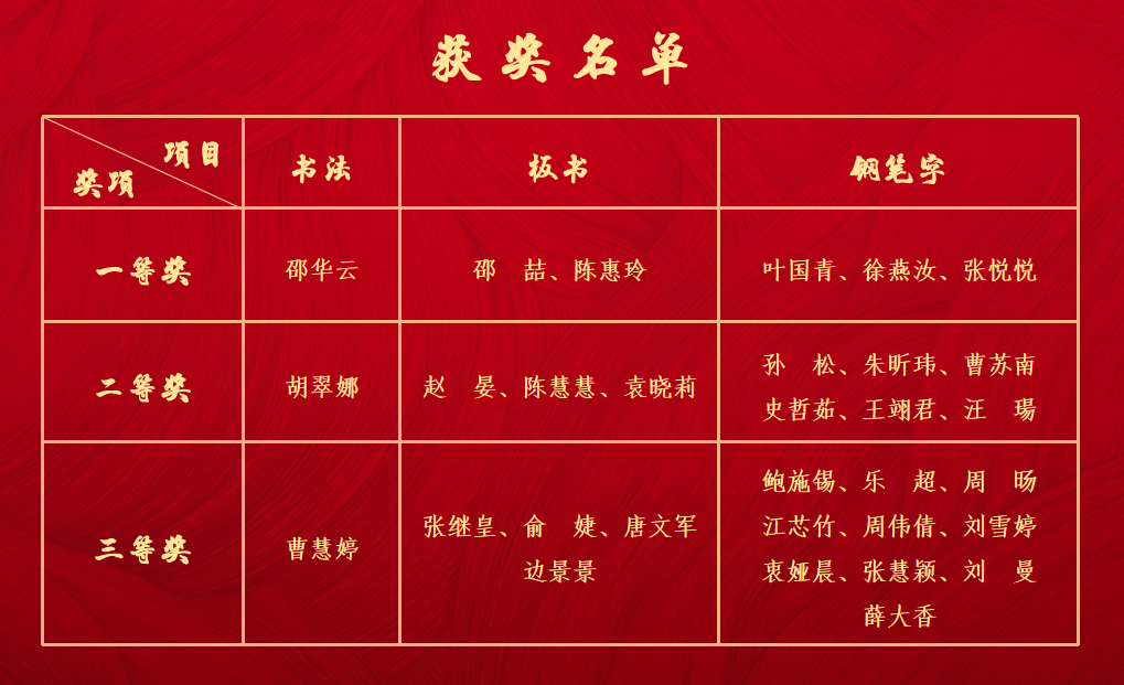 据悉,本次比赛3个项目同步开展,书写内容由校工会统一印制、统一发放,保障赛事规范有序。大赛实行盲评制度,评委依据书写规范、笔法技巧、版面布局、艺术美感等标准,对所有参赛作品进行现场评分,确保评选公平公正。经过紧张激烈的角逐,按照参赛人数60%的获奖比例,最终评选出一等奖6人、二等奖10人、三等奖15人。