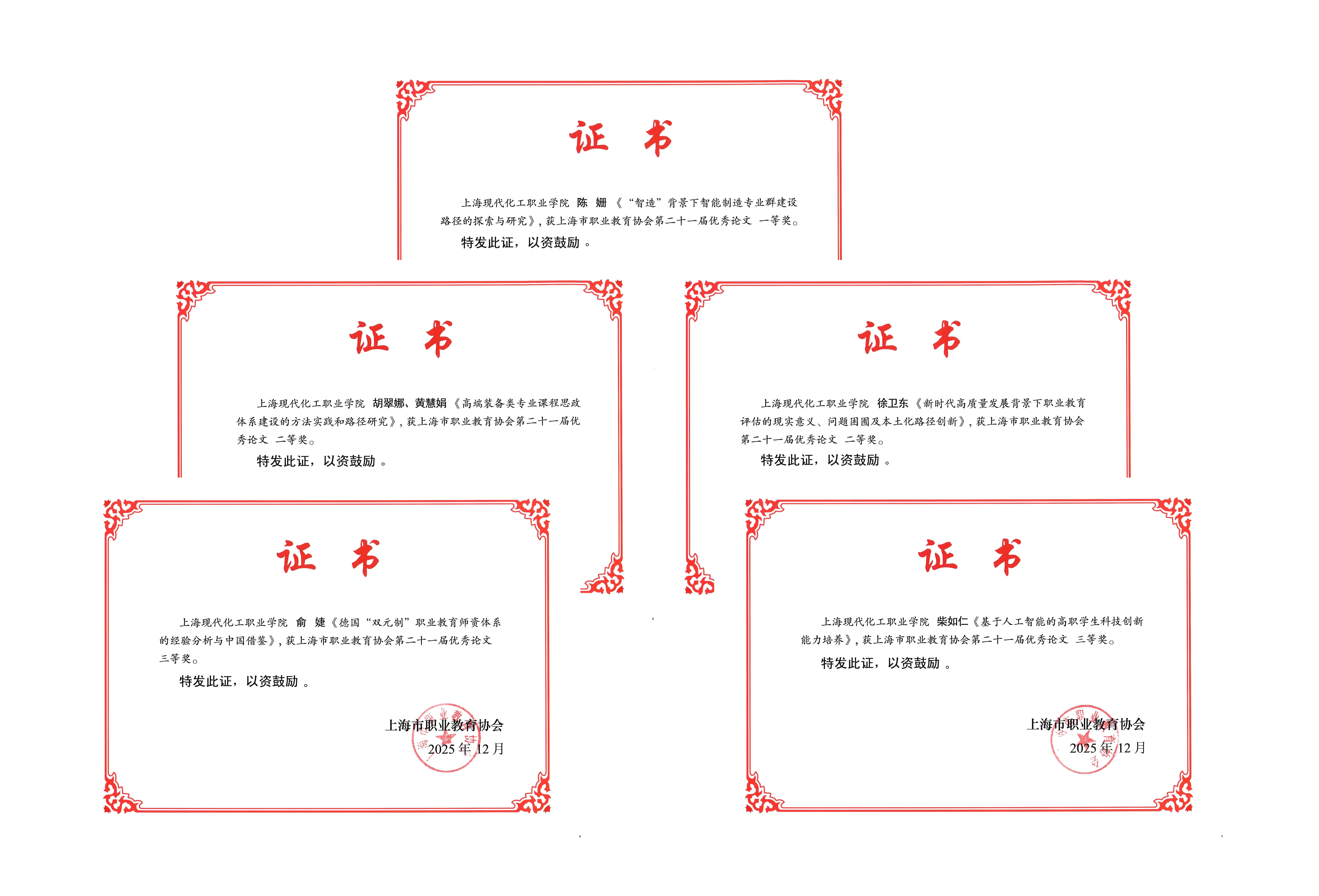 日前,学校科研处收到上海职业教育协会颁发的第二十一届优秀论文获奖证书,我校陈姗、徐卫东等六位教师分别荣获一、二、三等奖,获奖数高居全市参评院校榜首,这也是我校继去年之后第二次取得这一佳绩。