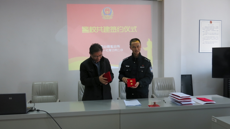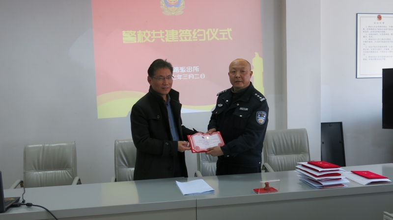 最后,学校和派出所签署治安保卫工作责任书,我校聘请副所长谢永刚为校外法制副校长、殷群警官为治安辅导员。