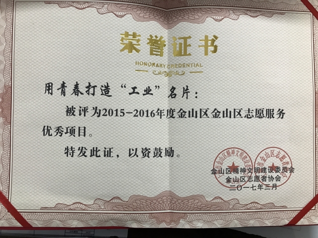 上海市金山区创建全国文明城区活动如火如荼,文明之风如三月暖阳福耀金山。正值学雷锋日之际,全区社会各界举办了各式各类的志愿者活动。青年志愿者活动,是以倡导和推动爱心助人、奉献社会为宗旨,是学校对学生进行思想政治和传统美德教育的重要途径,成为我校共青团工作和青年工作的有机载体。在校党委的领导和校团委唐辰炜老师的组织下,我校“用青春打造工业名片”志愿者服务项目荣获2015-2016年度金山区志愿服务优秀项目。